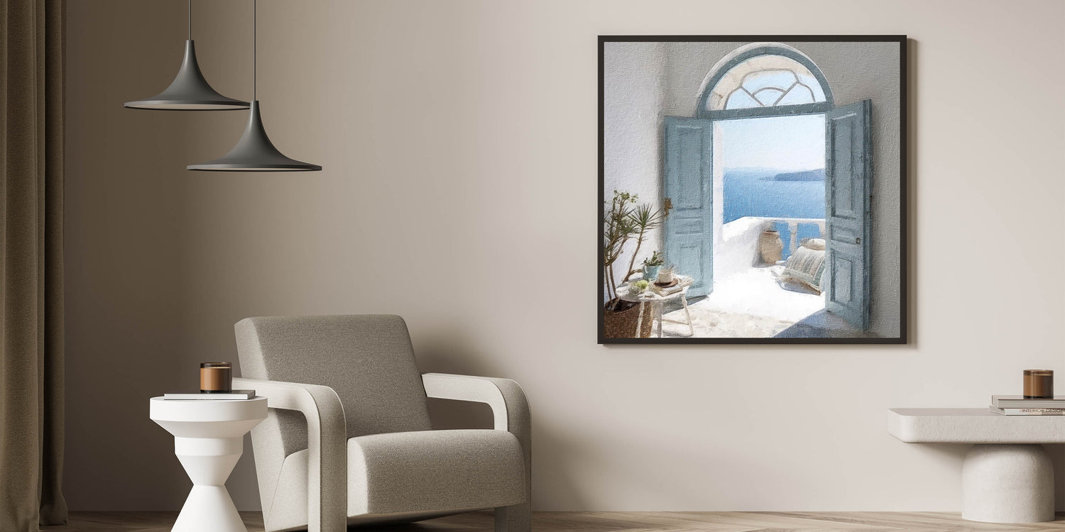 Step into the serene beauty of the Greek islands with our Arched Blue Door Art. This breathtaking piece features an open arched blue door leading to a sunlit terrace overlooking the calm waters of the Aegean Sea. The soothing scene captures the essence of a tranquil Greek morning, complete with whitewashed walls, a cozy seating area, and a gentle breeze. The soft blue hues and elegant architectural details make this artwork a perfect choice for adding a touch of Mediterranean elegance and relaxation to your space.