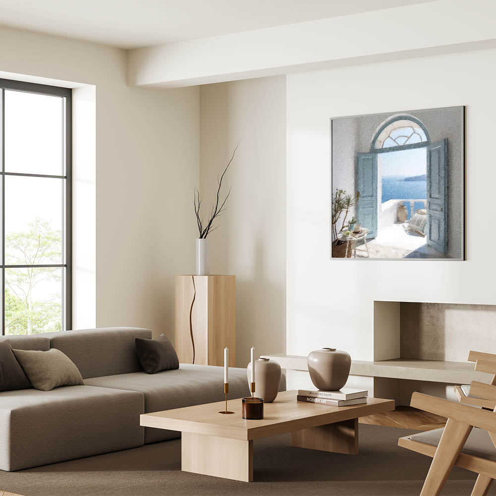 Bring the calming atmosphere of the Greek islands into your home with this captivating artwork. It’s a timeless piece that exudes relaxation and invites you to enjoy the peaceful beauty of the Mediterranean coast.
