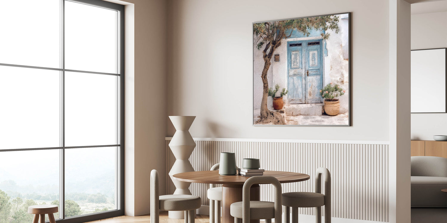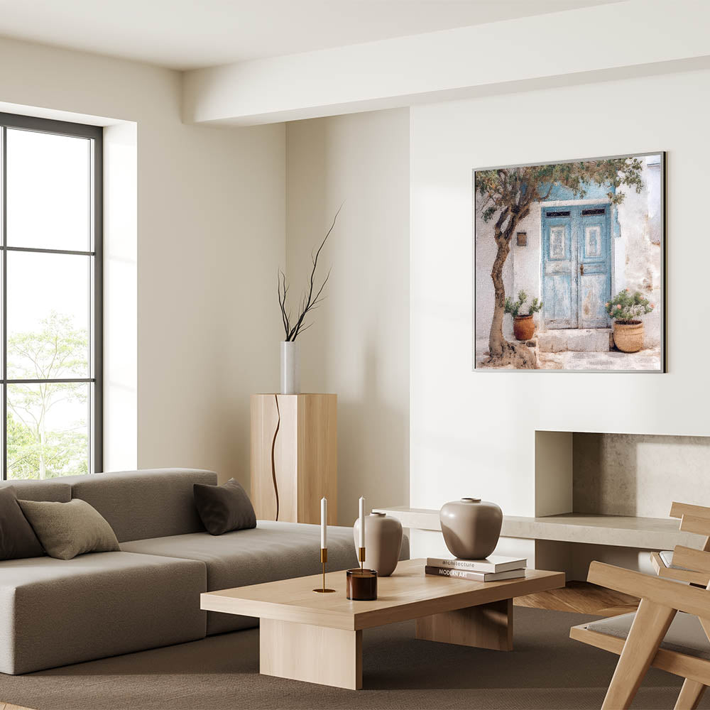 Immerse yourself in the charm of the Greek islands with our Rustic Blue Double Door Art. This exquisite piece features a weathered blue double door framed by a whitewashed wall, with terracotta pots brimming with blooming flowers adding a touch of color. The tranquil setting, shaded by a twisted tree, perfectly captures the essence of a serene Greek village. The soft blue tones and rustic textures bring a sense of nostalgia and elegance, making this artwork a perfect addition to any space seeking a touch of Mediterranean charm.