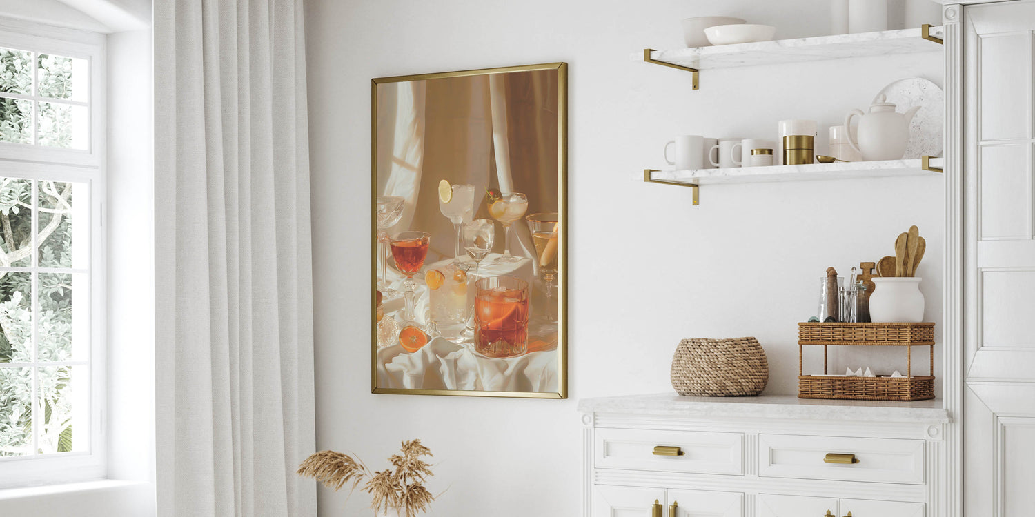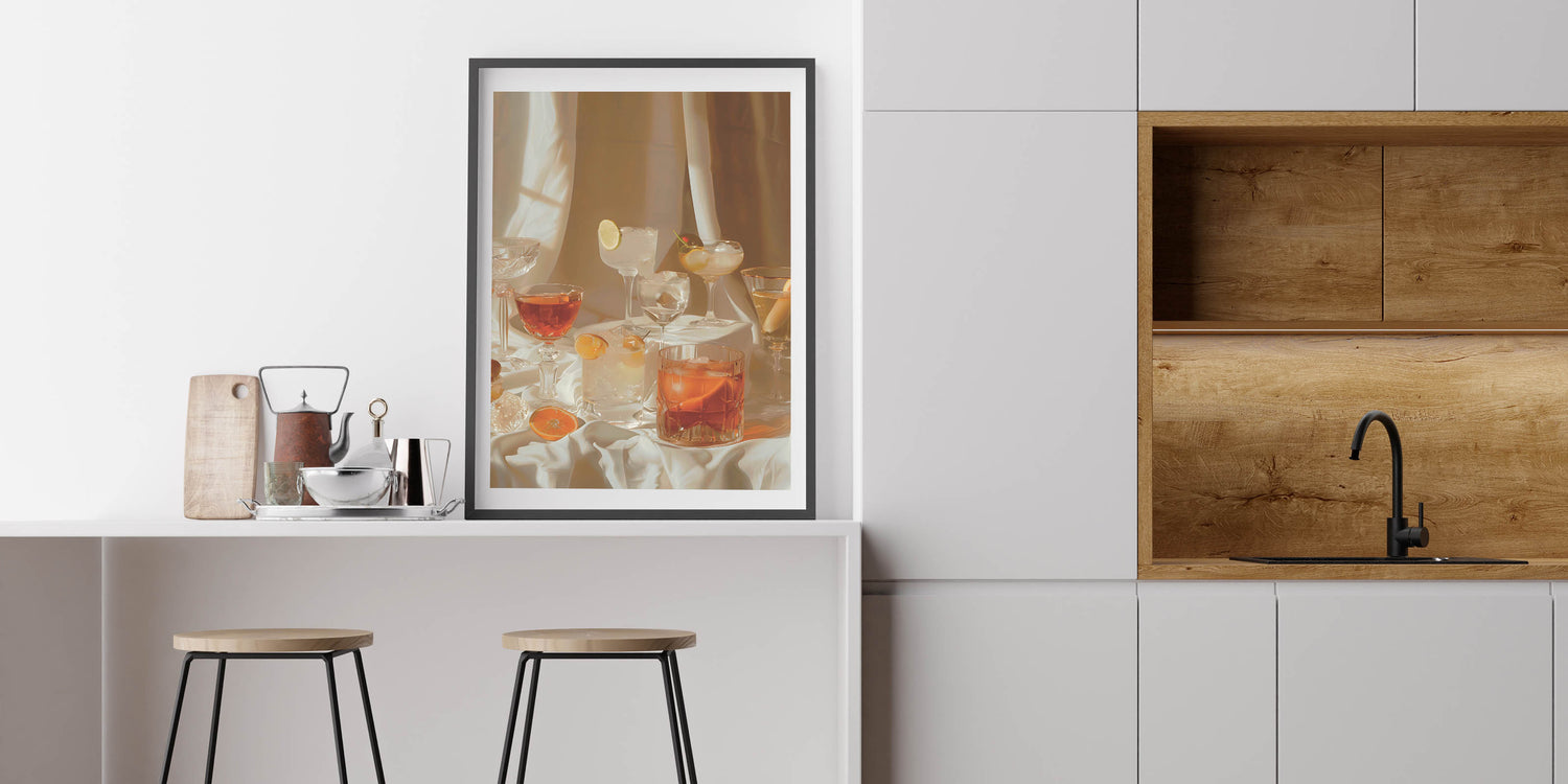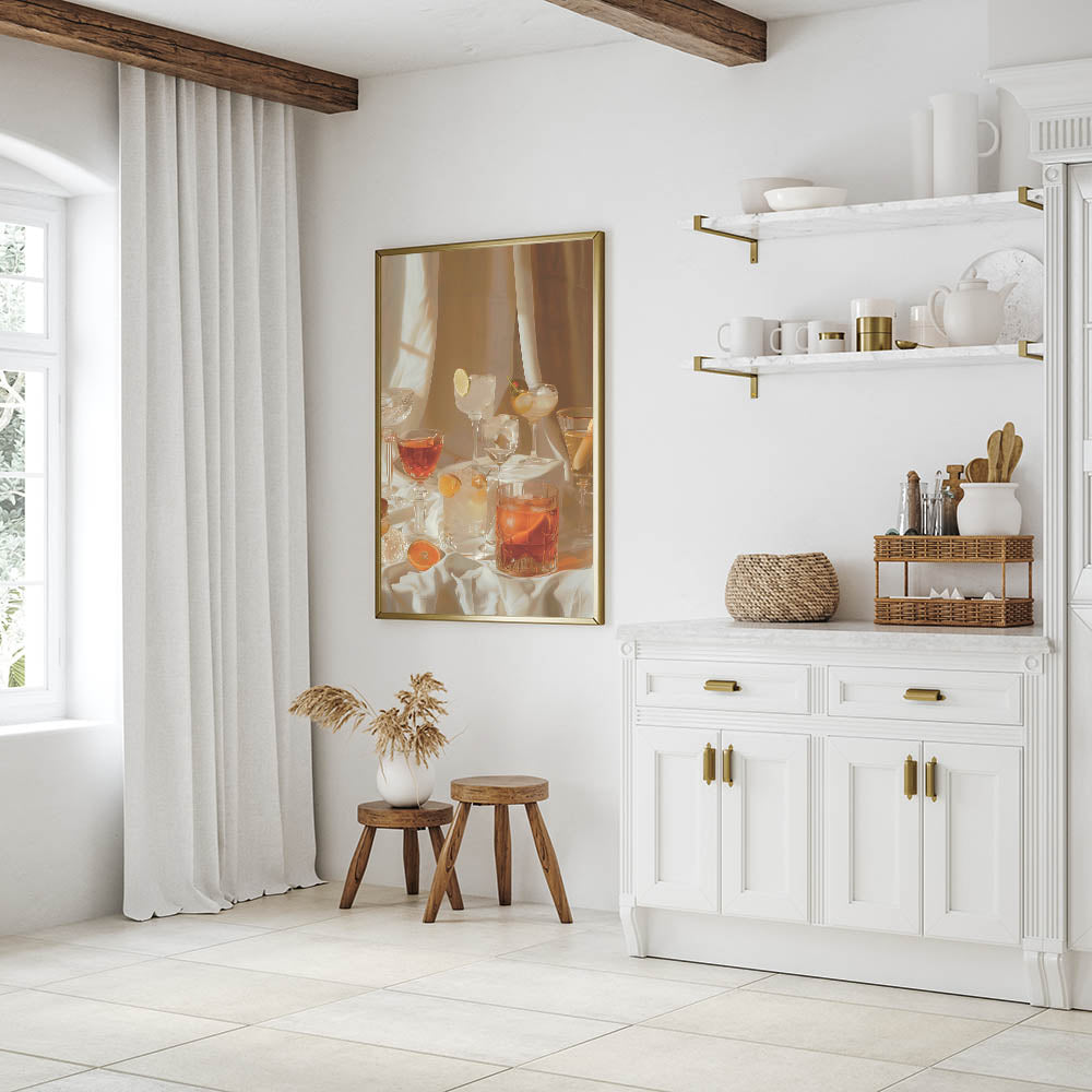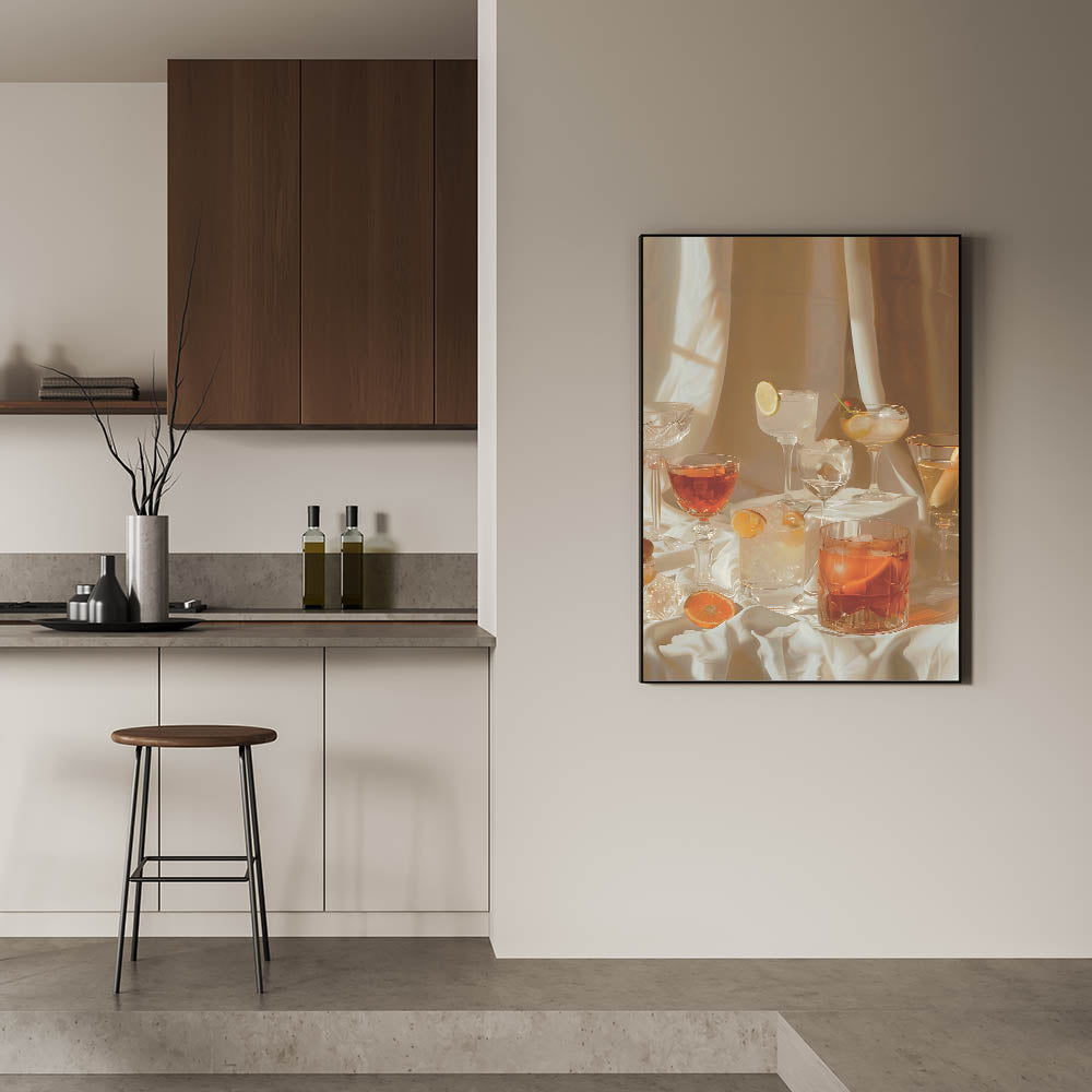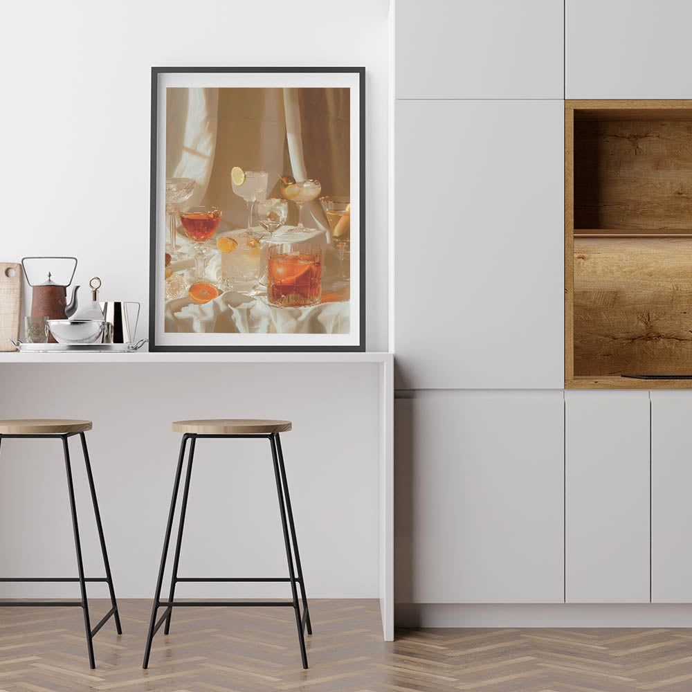 This cocktail art print adds warmth and sophistication, making it an eye-catching centerpiece in a bar decor collection. Whether displayed in a café, lounge, or home bar, this beverage art decor brings a refined yet inviting aesthetic to any space.