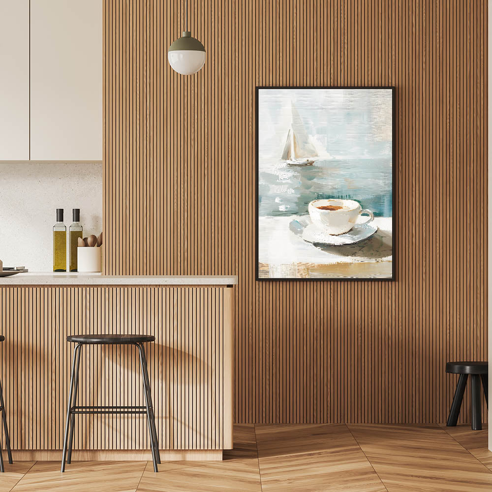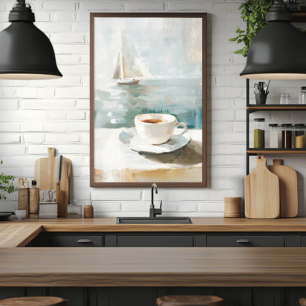 Start your day with the calm and serenity of the sea with this coffee wall art featuring a steaming cup of coffee set against a breathtaking coastal backdrop. A sailboat drifts effortlessly on the water, bathed in soft, natural light. The delicate brushstrokes and airy color palette create a tranquil, refreshing atmosphere, making this artwork a perfect addition to a kitchen, coffee corner, or beach house decor.
