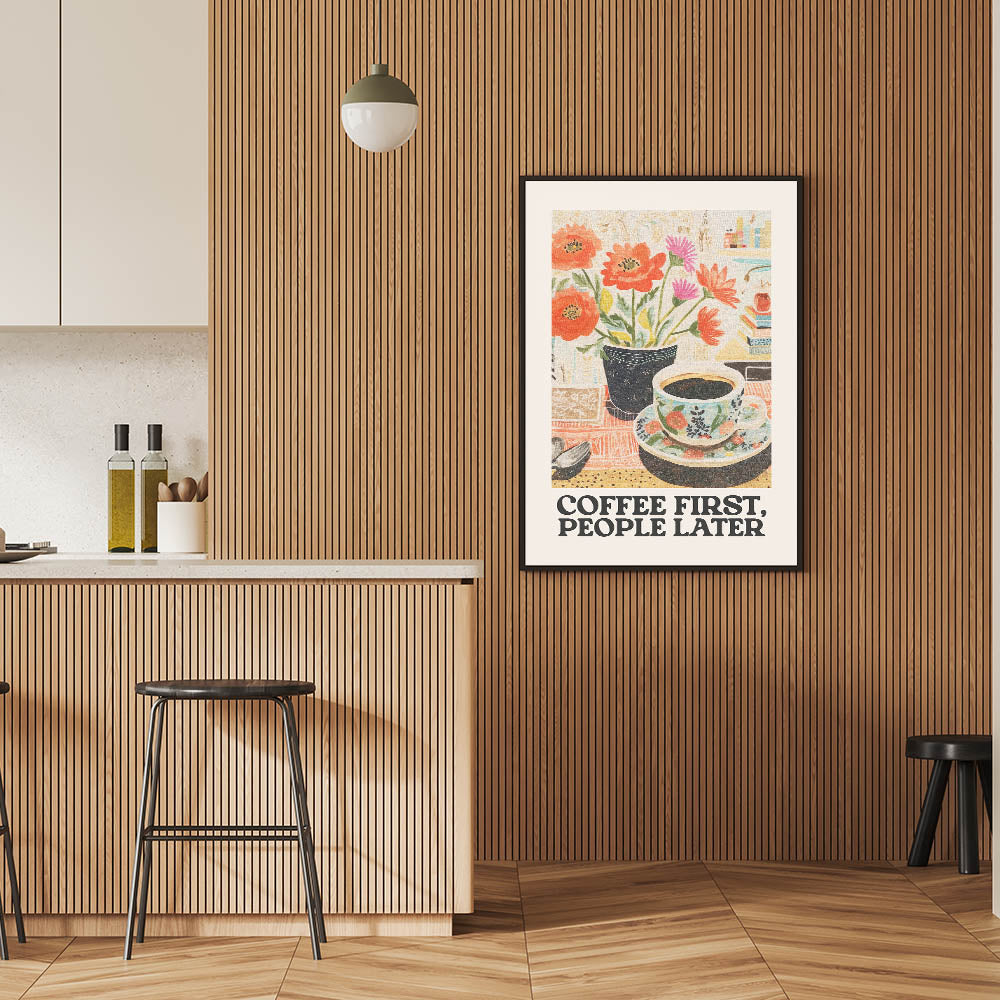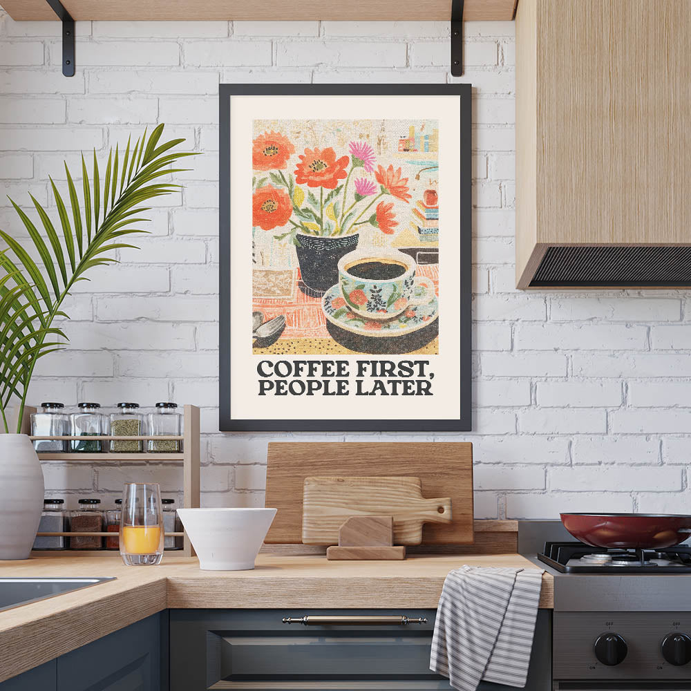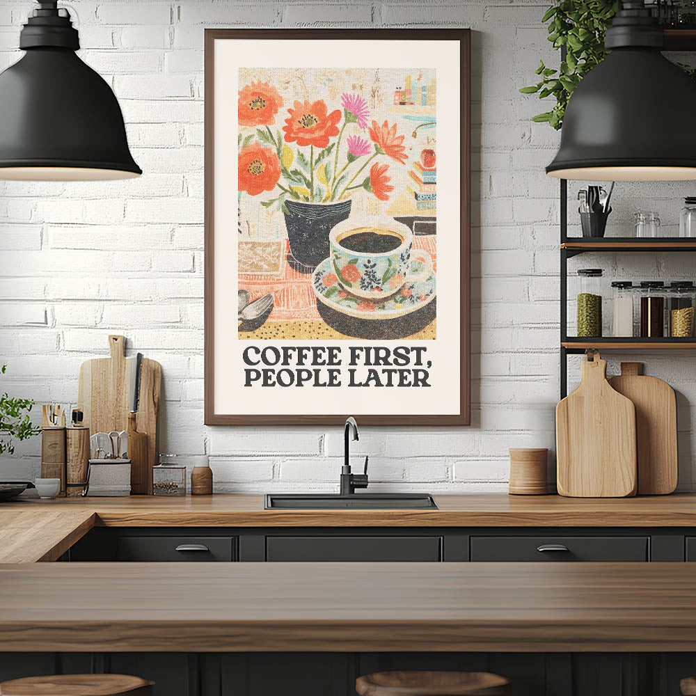 Coffee First, People Later – Floral Coffee Wall Art for Kitchen & Café