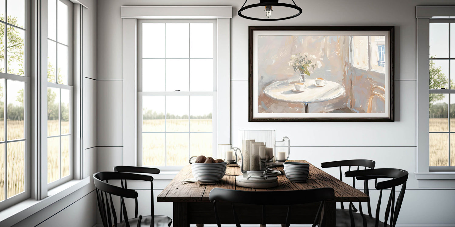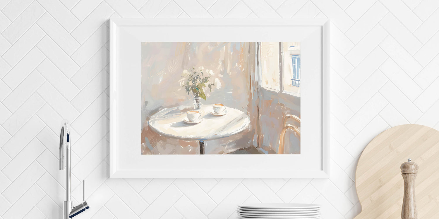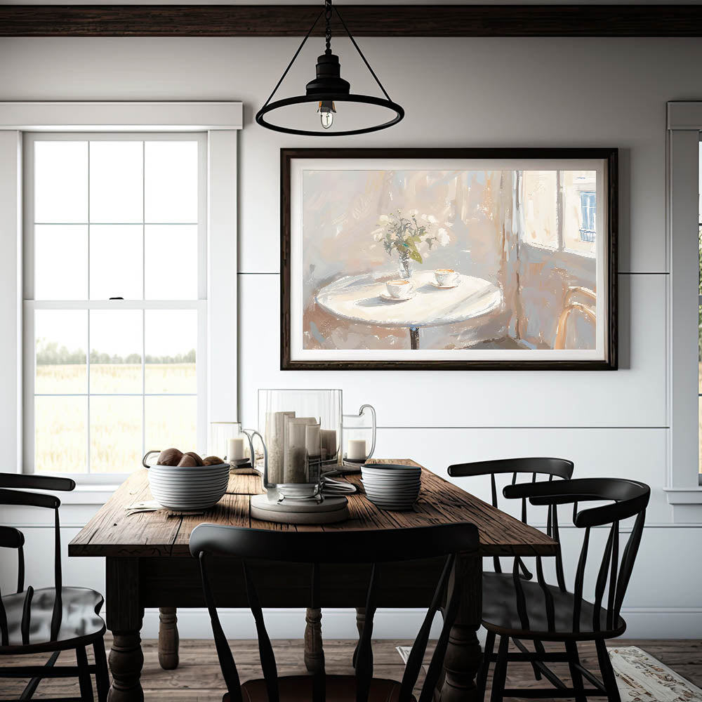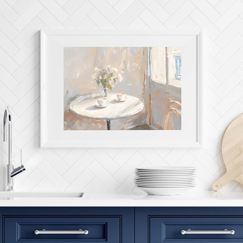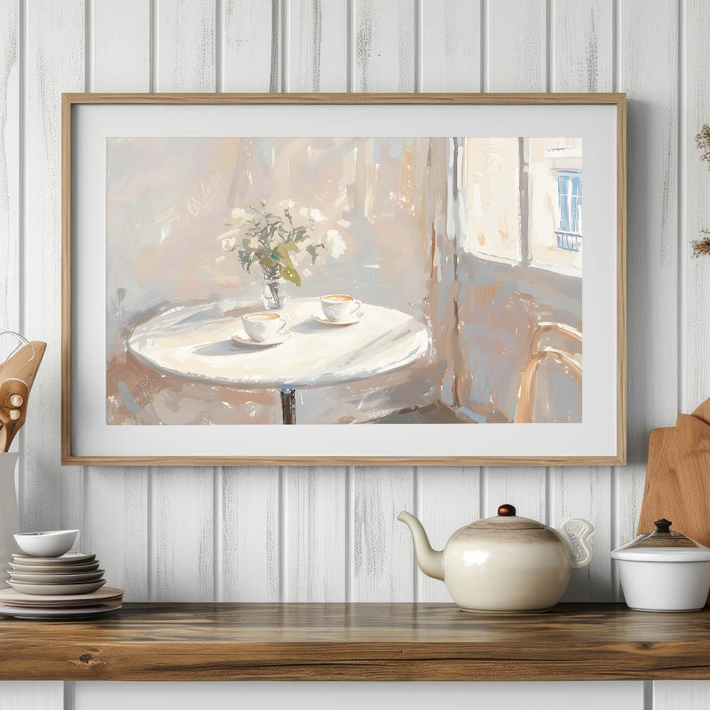 Bring warmth and charm to your space with this coffee wall art featuring a cozy café-inspired scene. This inviting artwork showcases two steaming cappuccinos on a round table, bathed in soft sunlight filtering through a window. The delicate brushstrokes and warm neutral tones create a peaceful ambiance, making this a perfect addition to a kitchen, coffee corner, or café decor.