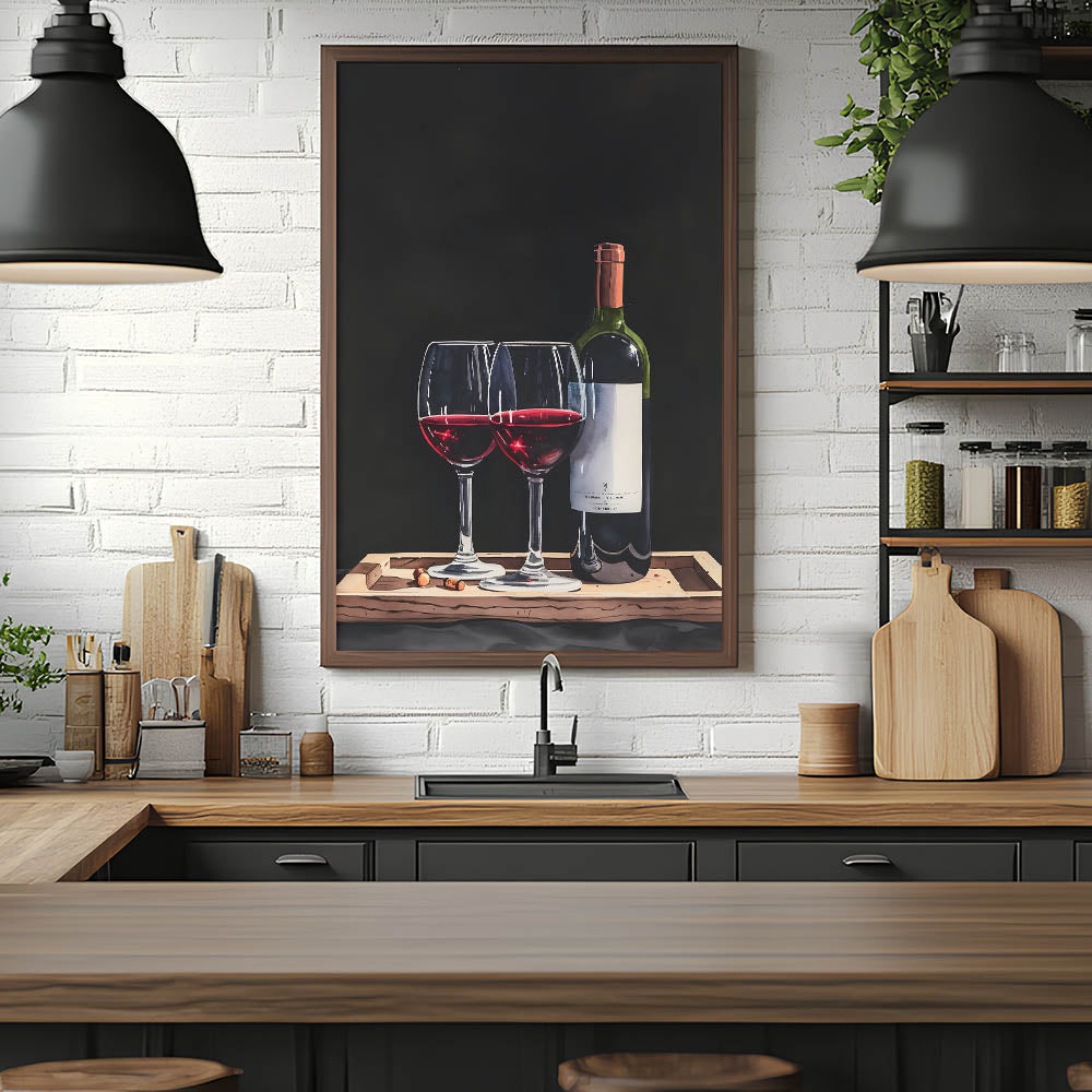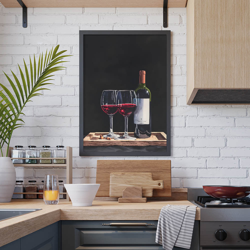 Add sophistication to your space with this Elegant Red Wine Wall Art, a stunning depiction of two glasses of deep red wine alongside a classic wine bottle. Set against a dark and moody background, this artwork exudes luxury and elegance, making it the perfect wine art decor for a home bar, dining room, or kitchen. The rich colors and detailed reflections create an inviting atmosphere, ideal for wine enthusiasts and art lovers alike.