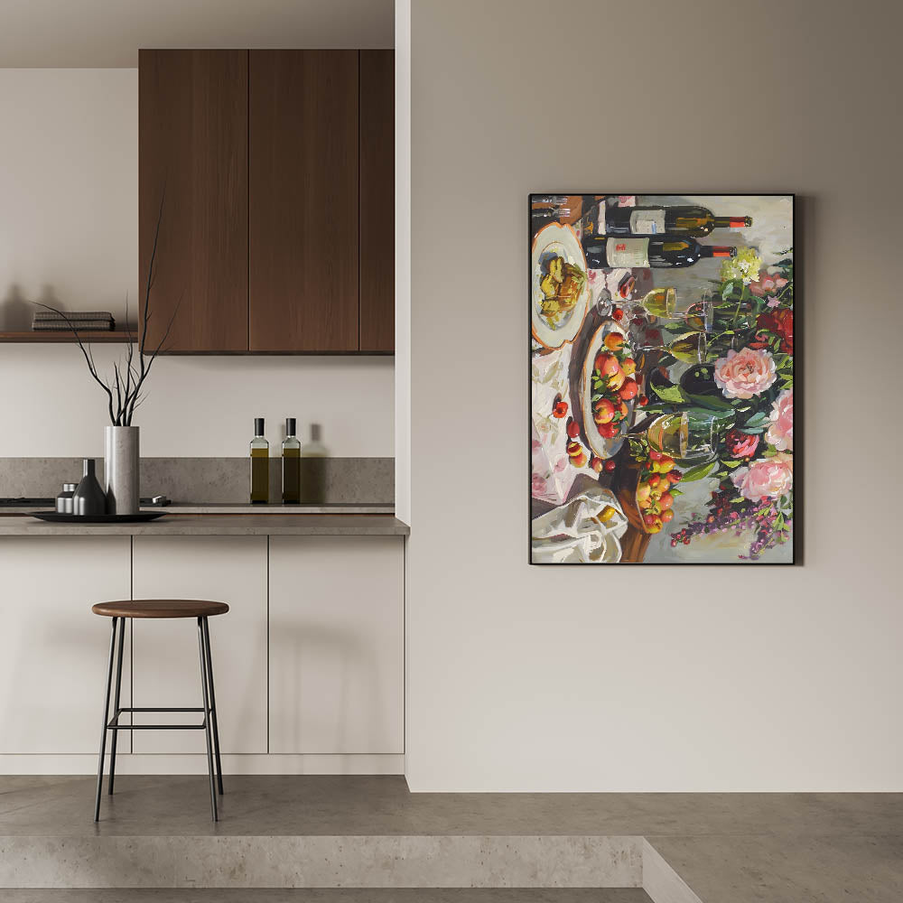 Bring sophistication and warmth to your space with this Elegant Wine and Floral Feast Wall Art, a stunning oil painting-inspired artwork that captures the essence of a lavish dining experience. Featuring rich red and white wine bottles, delicate glasses filled with golden champagne, fresh fruits, and vibrant floral arrangements, this beverage art decor piece exudes luxury and refinement. The harmonious composition of soft pinks, deep reds, and lush greens creates an inviting ambiance, making it perfect for dining rooms, home bars, and kitchens.
