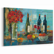 Enhance your dining room or wine bar with this stunning wine-themed wall art, featuring an artistic still life of red wine bottles, glasses, fresh fruit, and a vase of vibrant red flowers. The bold blue and gold tones create a modern yet rustic feel, making this beverage wall art a perfect focal point for kitchens, bars, and dining spaces.