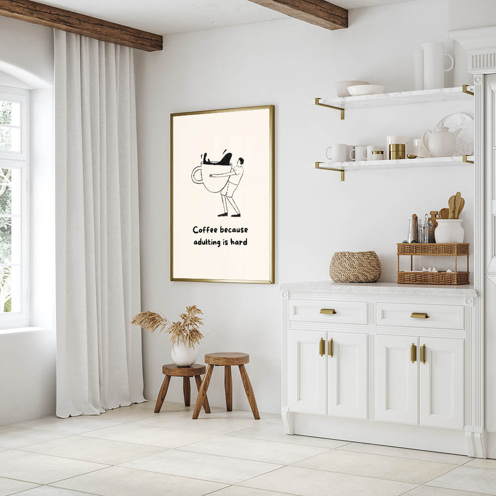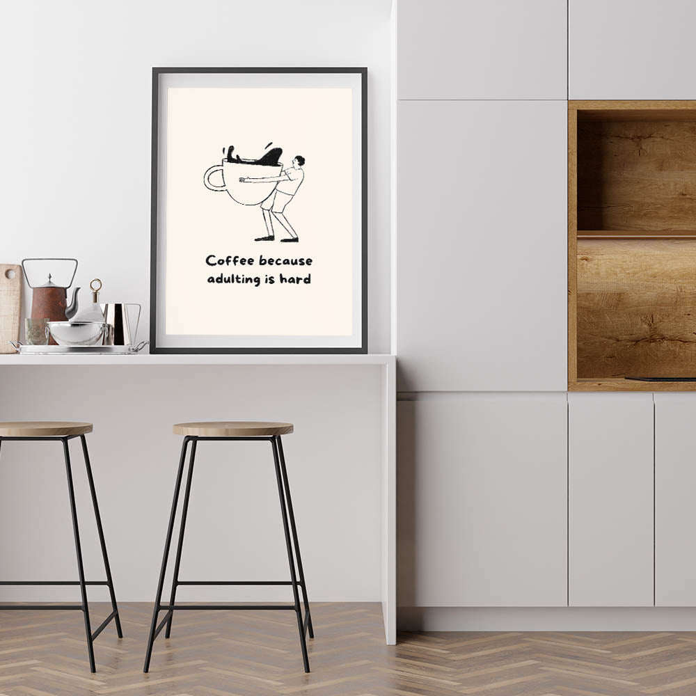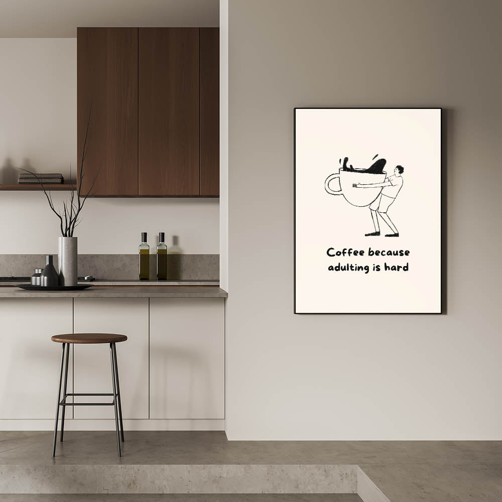 Start your day with a smile with this funny coffee wall art featuring a playful illustration of a person carrying an oversized coffee cup. With the relatable phrase "Coffee because adulting is hard", this artwork is the perfect addition to any coffee lover’s home, office, or café. Whether you need a caffeine boost or just a daily dose of humor, this beverage wall art is a great way to add personality to your space.