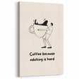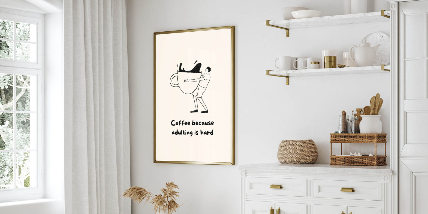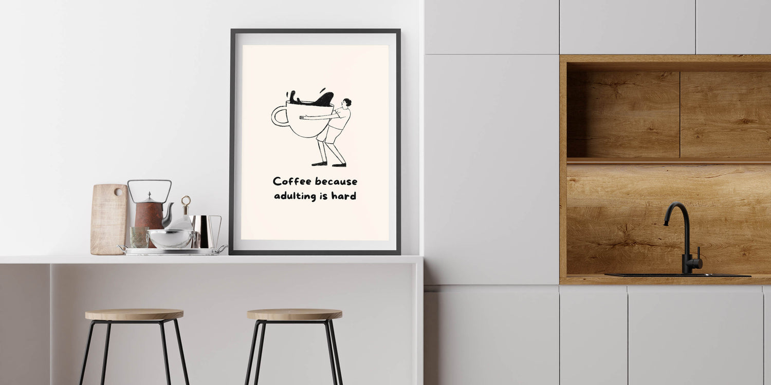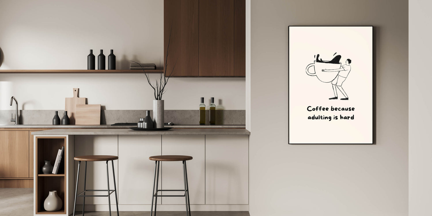 Start your day with a smile with this funny coffee wall art featuring a playful illustration of a person carrying an oversized coffee cup. With the relatable phrase "Coffee because adulting is hard", this artwork is the perfect addition to any coffee lover’s home, office, or café. Whether you need a caffeine boost or just a daily dose of humor, this beverage wall art is a great way to add personality to your space.