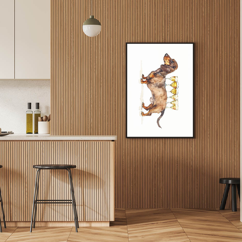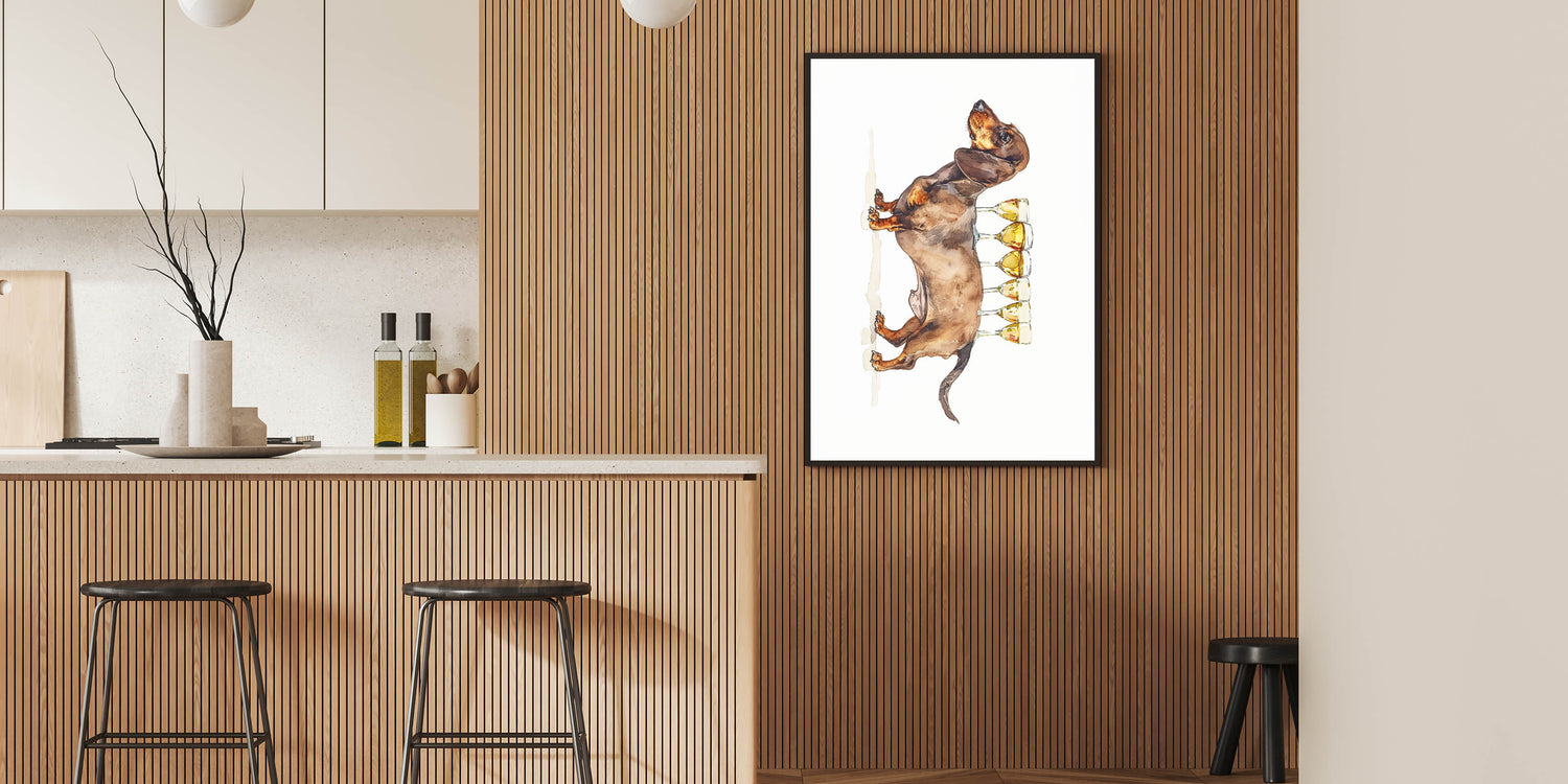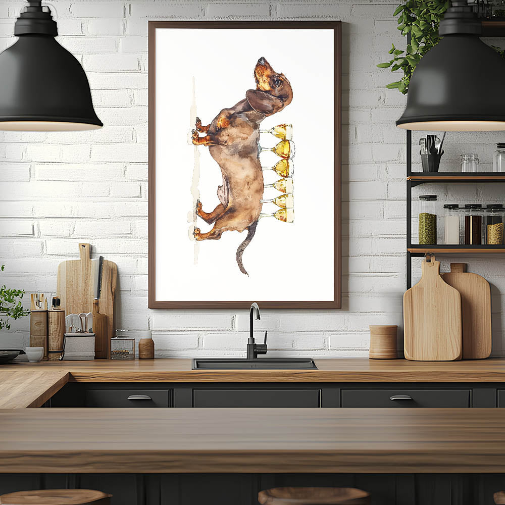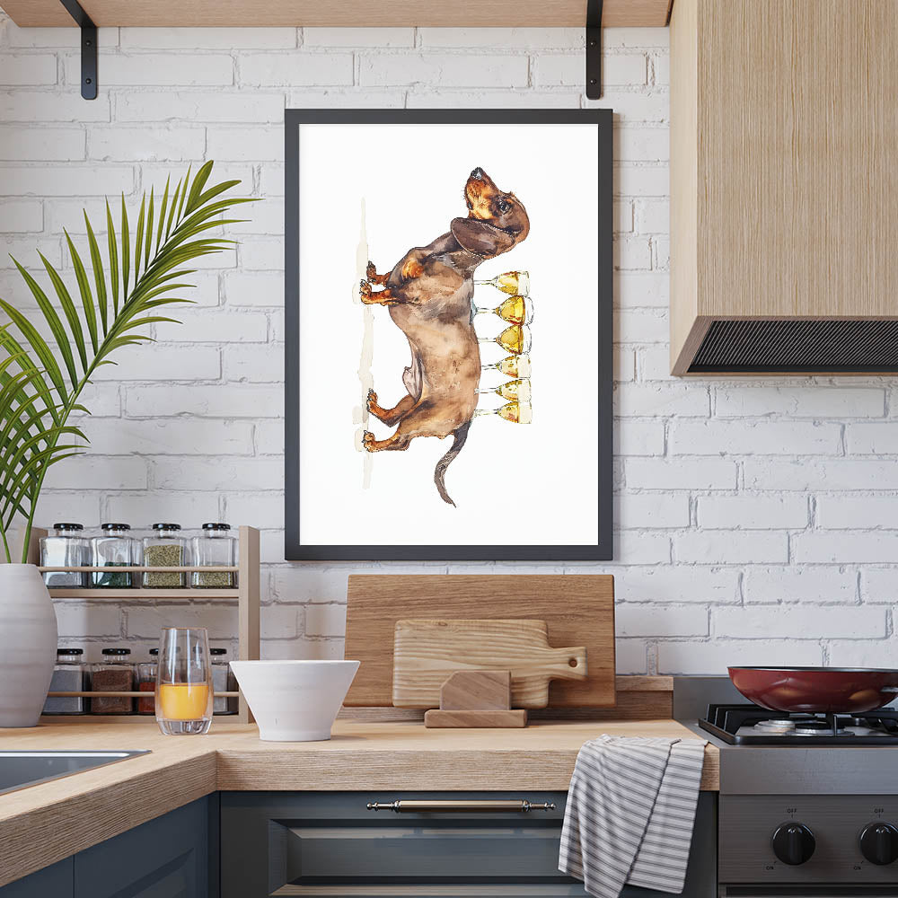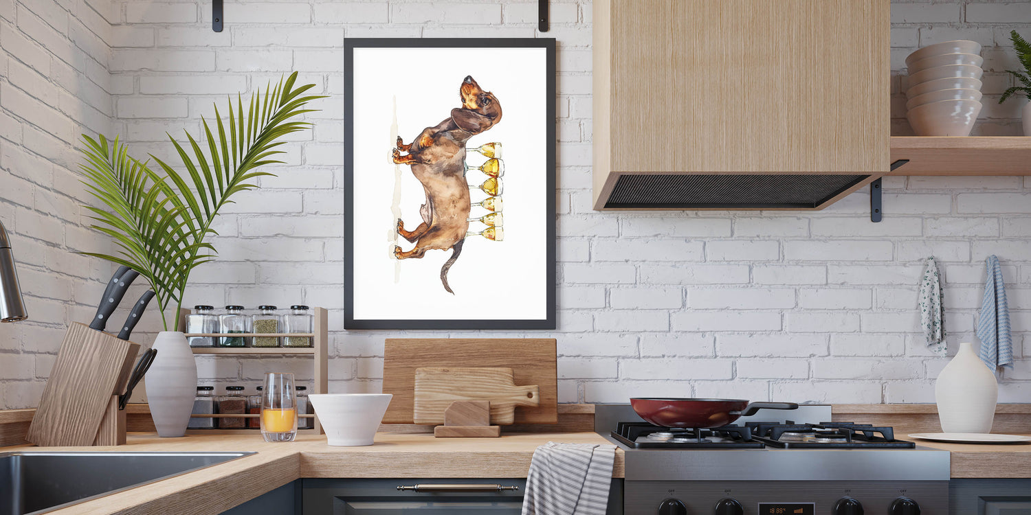 This wine art decor makes a wonderful gift for dachshund owners, pet lovers, or anyone who enjoys a touch of humor in their home decor. Elevate your kitchen art decor with this delightful and stylish print that captures the joy of good wine and good company.