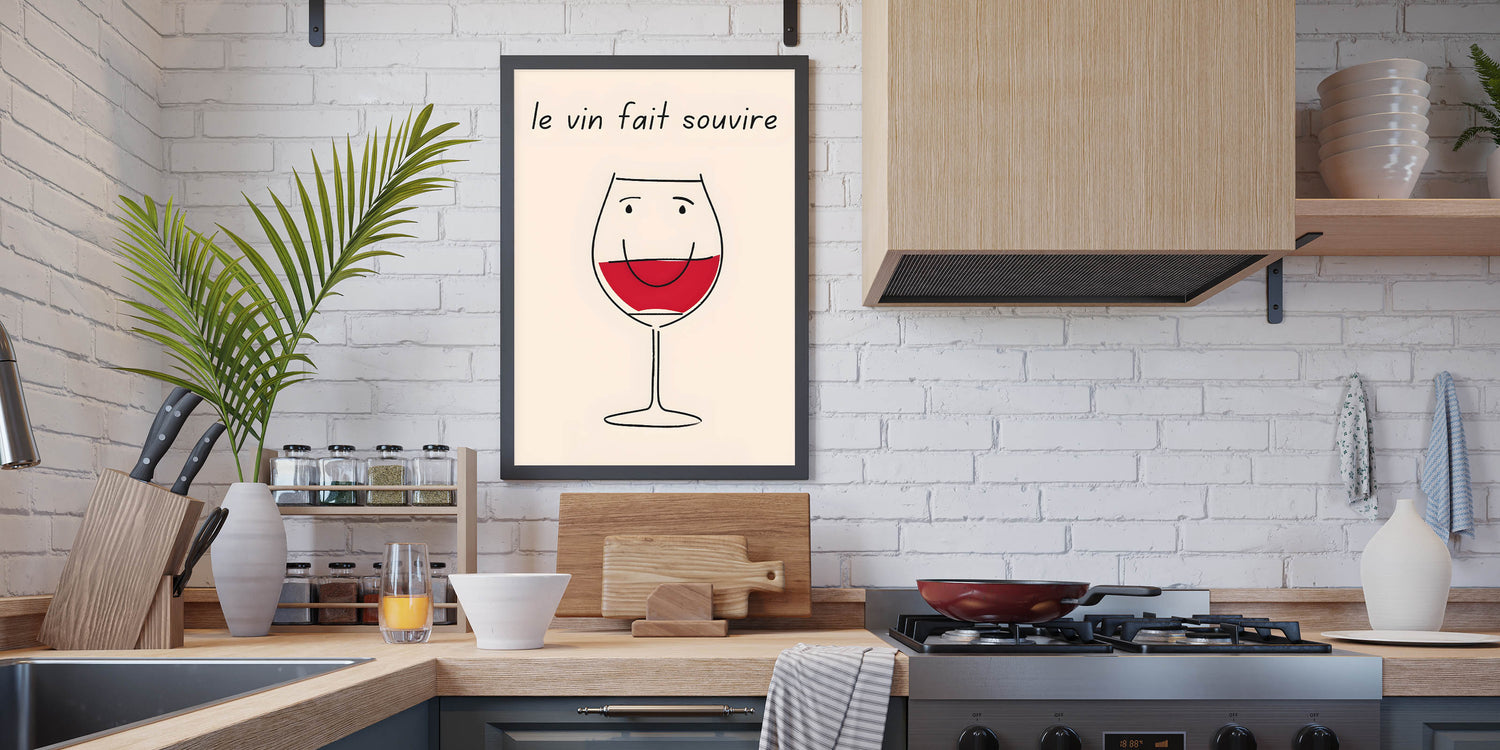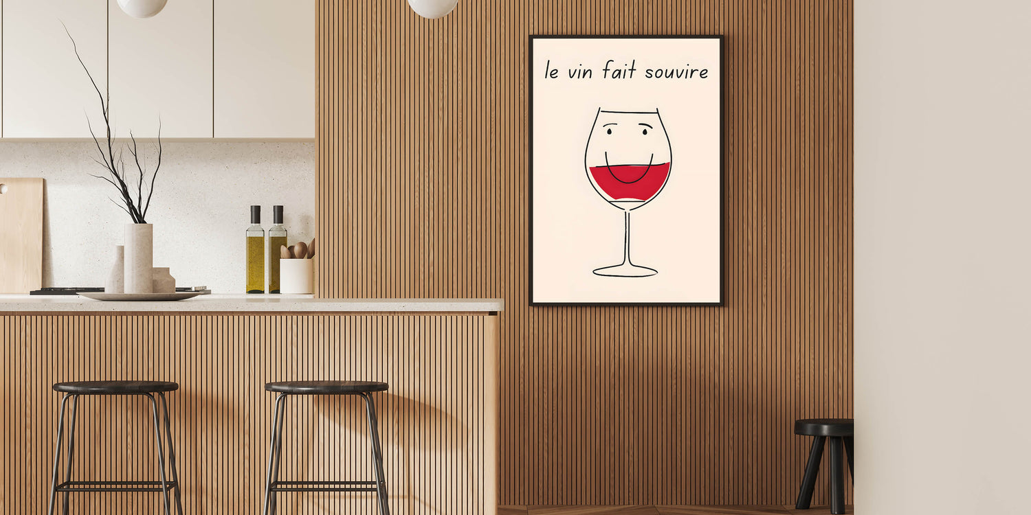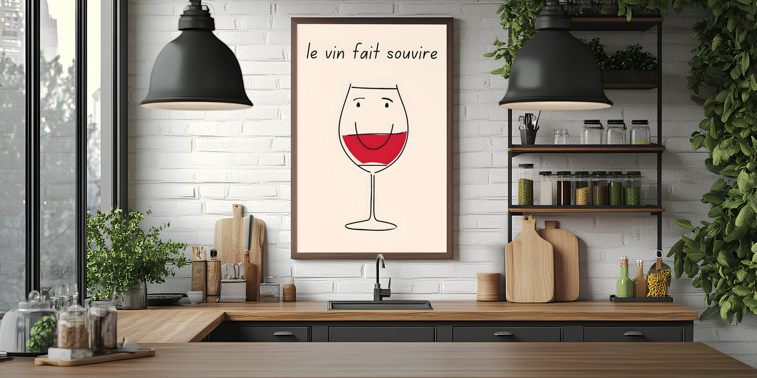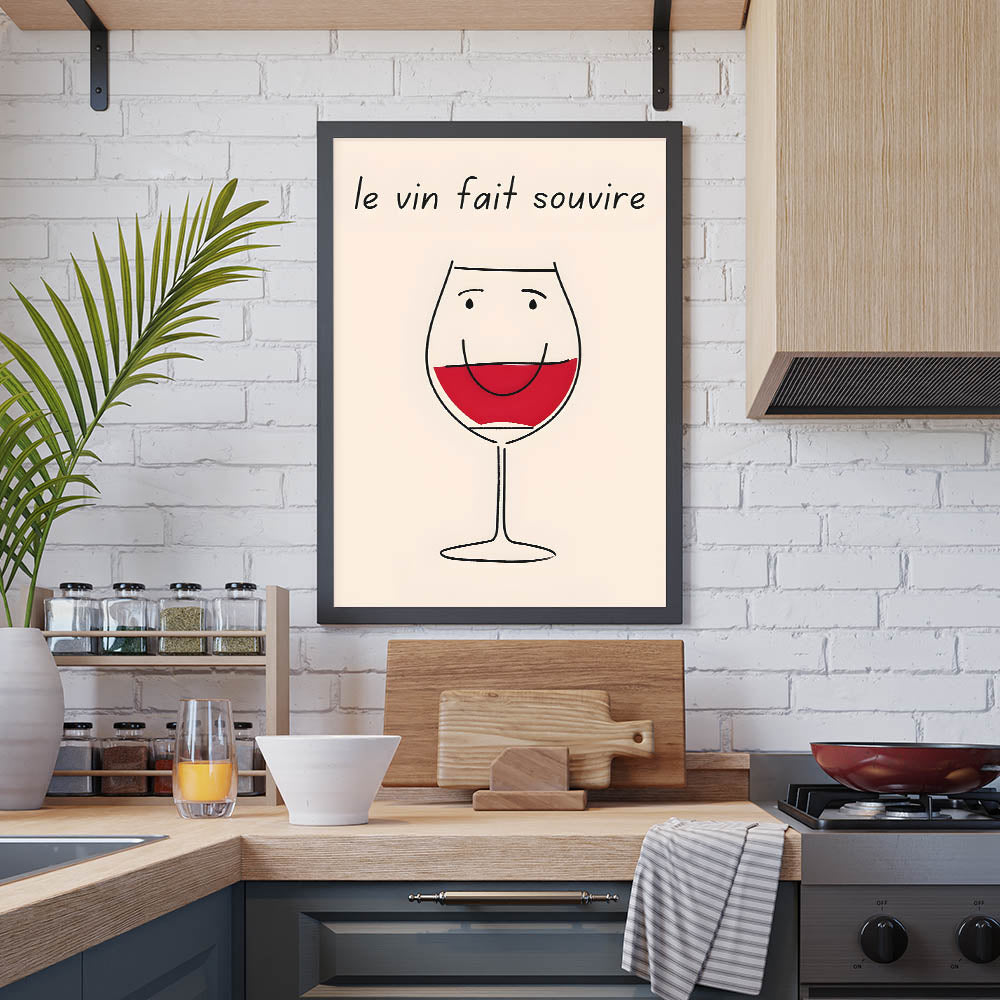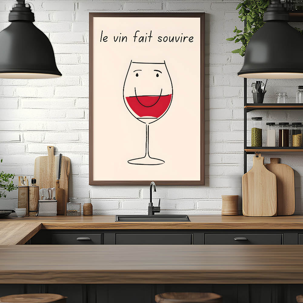 Add a touch of humor and charm to your space with this wine wall art featuring a smiling wine glass and the playful French phrase "Le vin fait sourire" (Wine makes you smile). The minimalist black-line design combined with a soft beige background and deep red wine accents makes this beverage wall art an elegant yet fun piece for bar decor, wine cellars, and kitchen spaces. Whether you're a wine enthusiast or simply enjoy lighthearted art, this print is a stylish way to celebrate your love for wine.