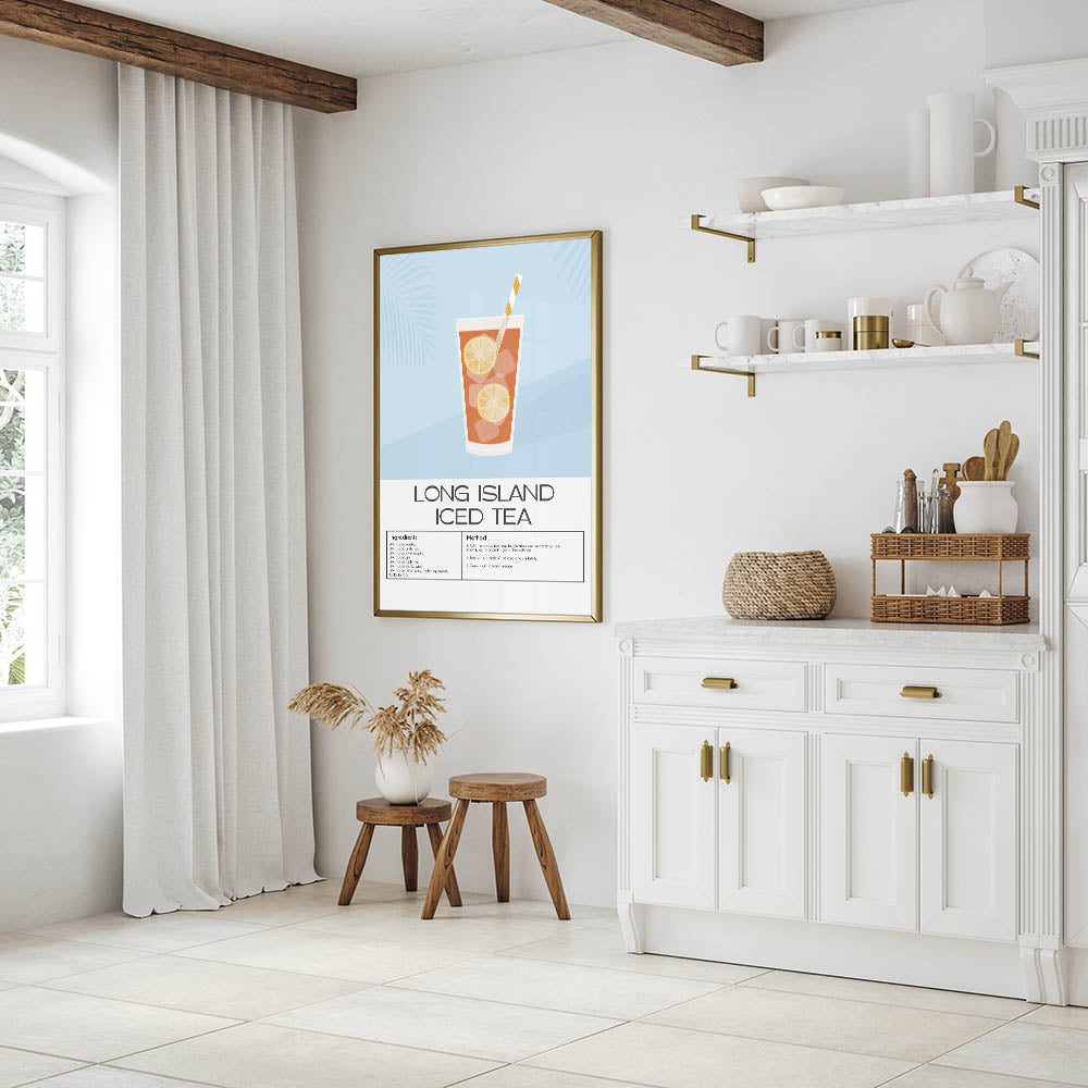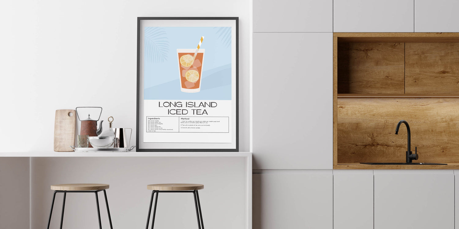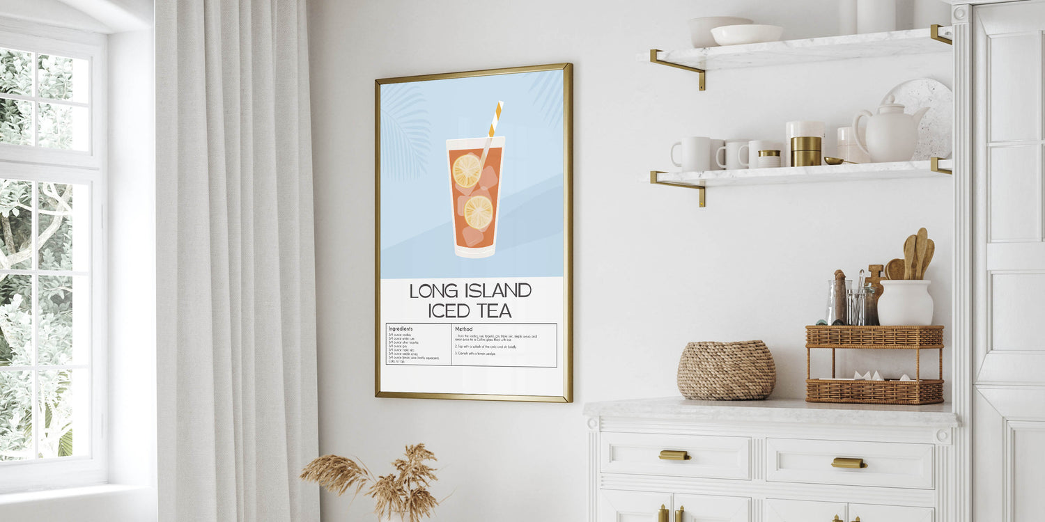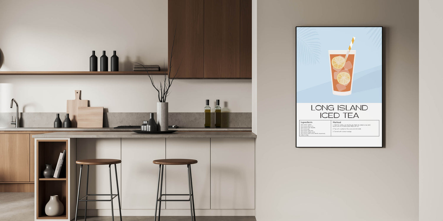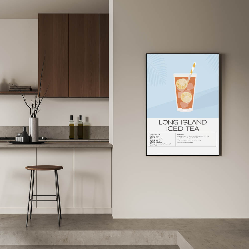 Enhance your space with this Long Island Iced Tea recipe wall art, a perfect blend of style and mixology. This drink-themed art print features a minimalist yet vibrant cocktail illustration, complete with an easy-to-follow recipe for the iconic Long Island Iced Tea. Whether for a bar, kitchen, or dining space, this cocktail art print makes a stylish and functional addition to any home or business.