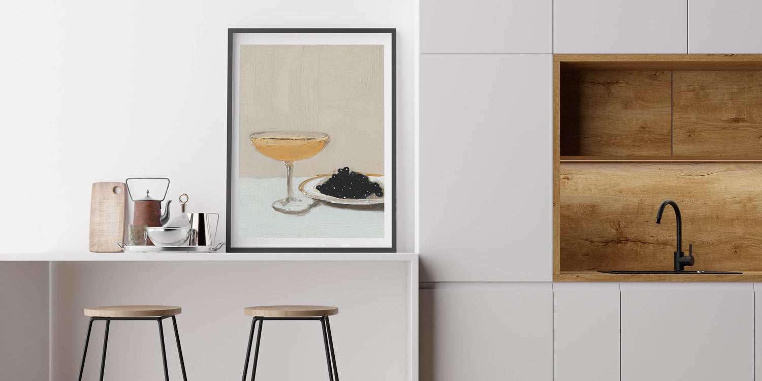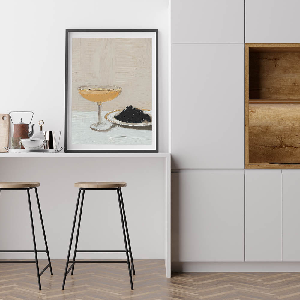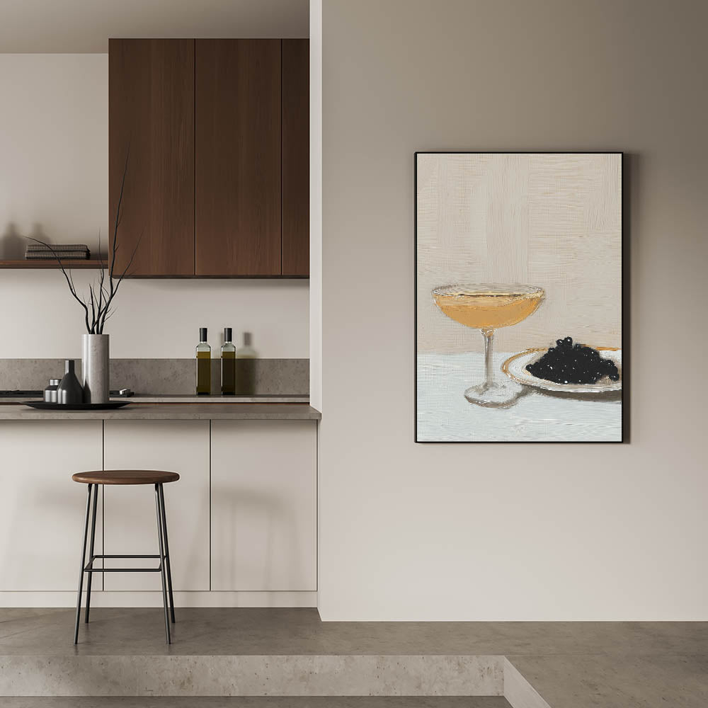 Elevate your space with this elegant drinks wall art featuring a sophisticated still life of a champagne coupe and black caviar. Perfect for a bar, kitchen, or dining area, this timeless artwork embodies luxury and refinement. The warm golden hue of the sparkling drink contrasts beautifully with the rich black caviar, creating an opulent yet minimalist aesthetic.