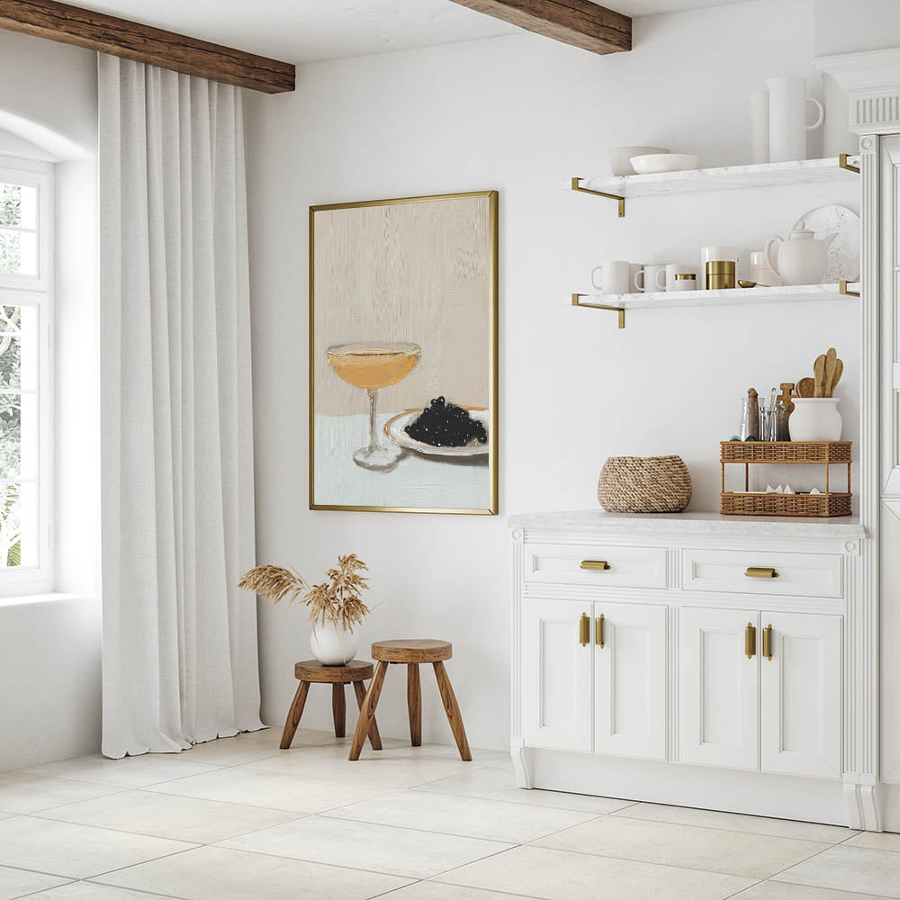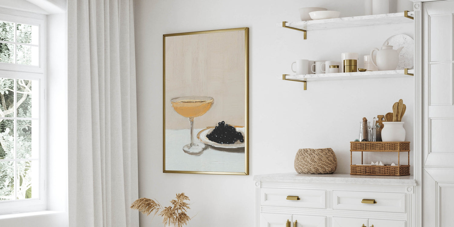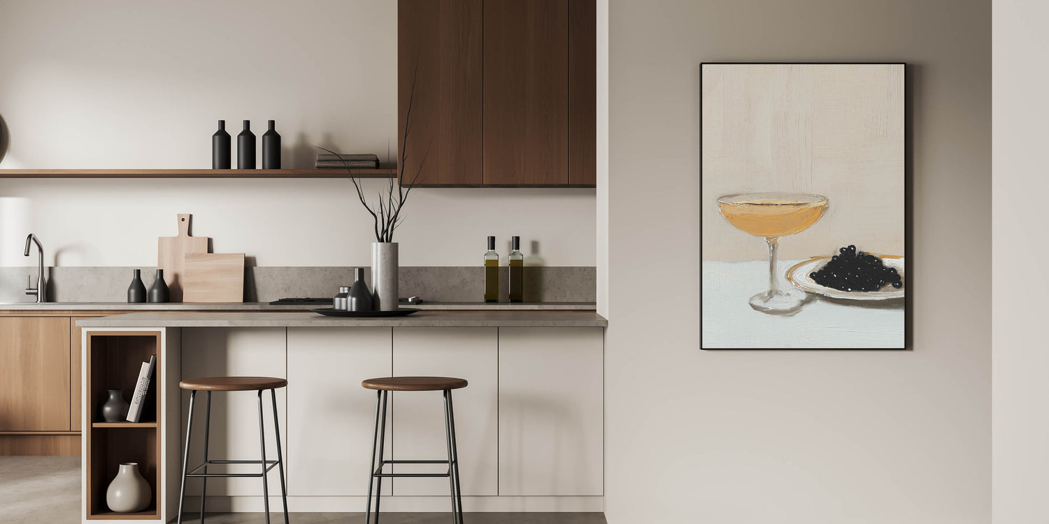 Elevate your space with this elegant drinks wall art featuring a sophisticated still life of a champagne coupe and black caviar. Perfect for a bar, kitchen, or dining area, this timeless artwork embodies luxury and refinement. The warm golden hue of the sparkling drink contrasts beautifully with the rich black caviar, creating an opulent yet minimalist aesthetic.
