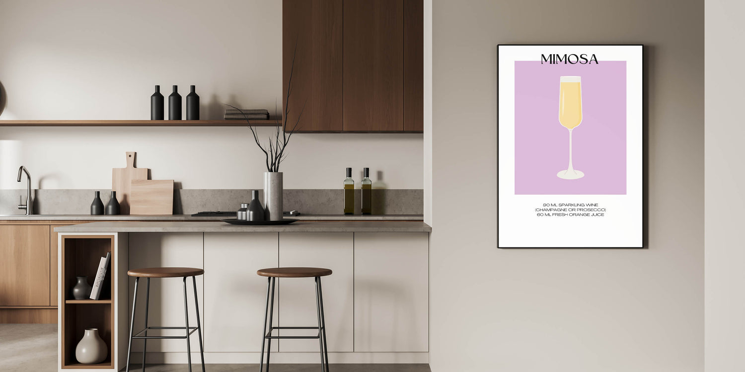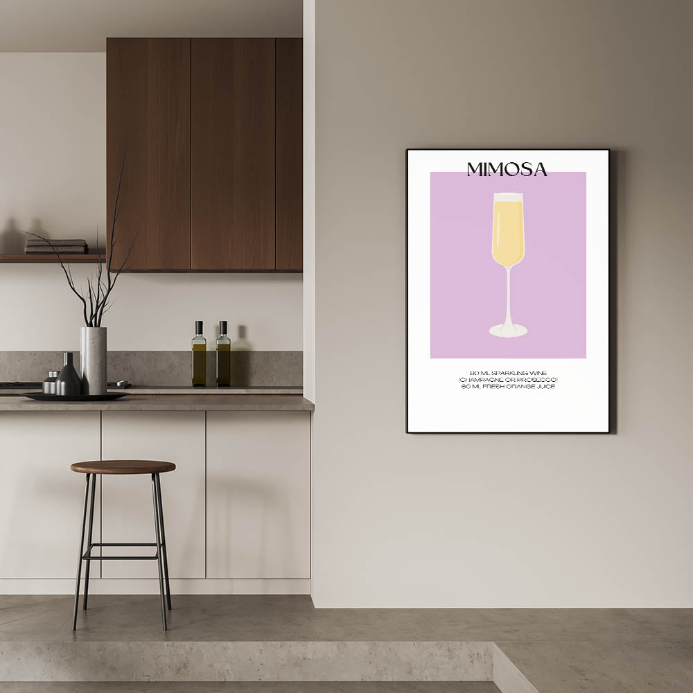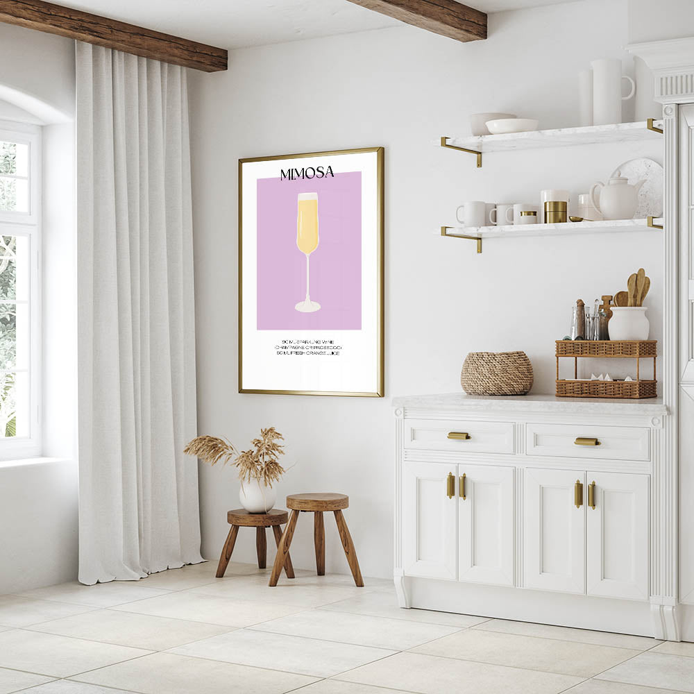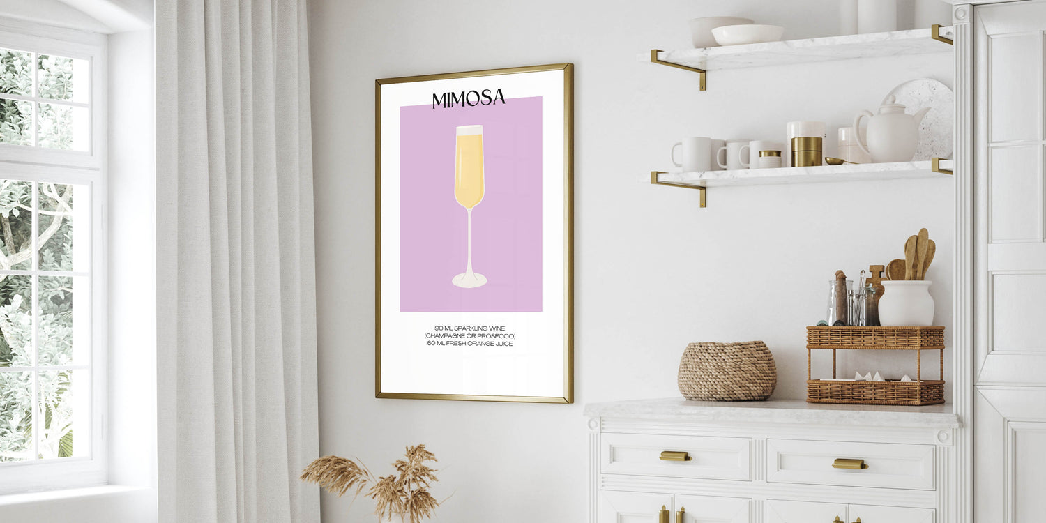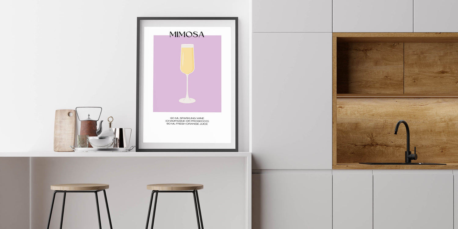 Perfect for those who love a good brunch, this Mimosa cocktail art print captures the fun and bubbly essence of the drink. Hang it in your dining room, kitchen, or home bar to bring a touch of beverage art decor to your space.