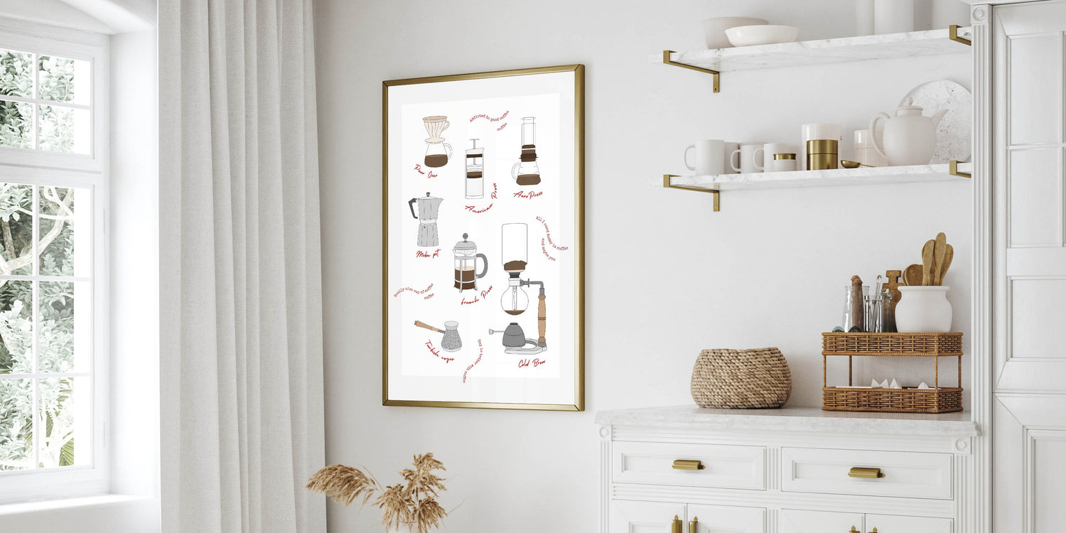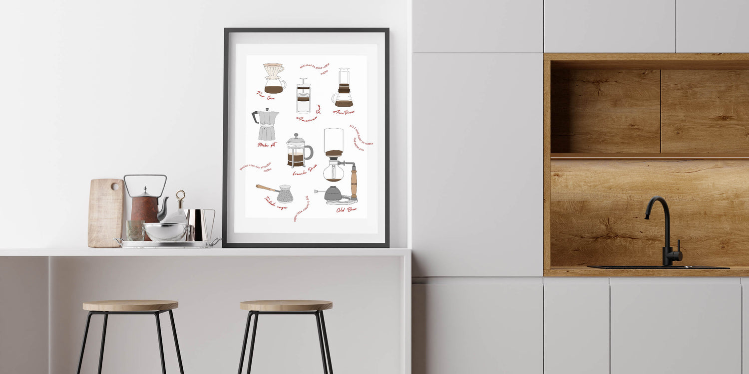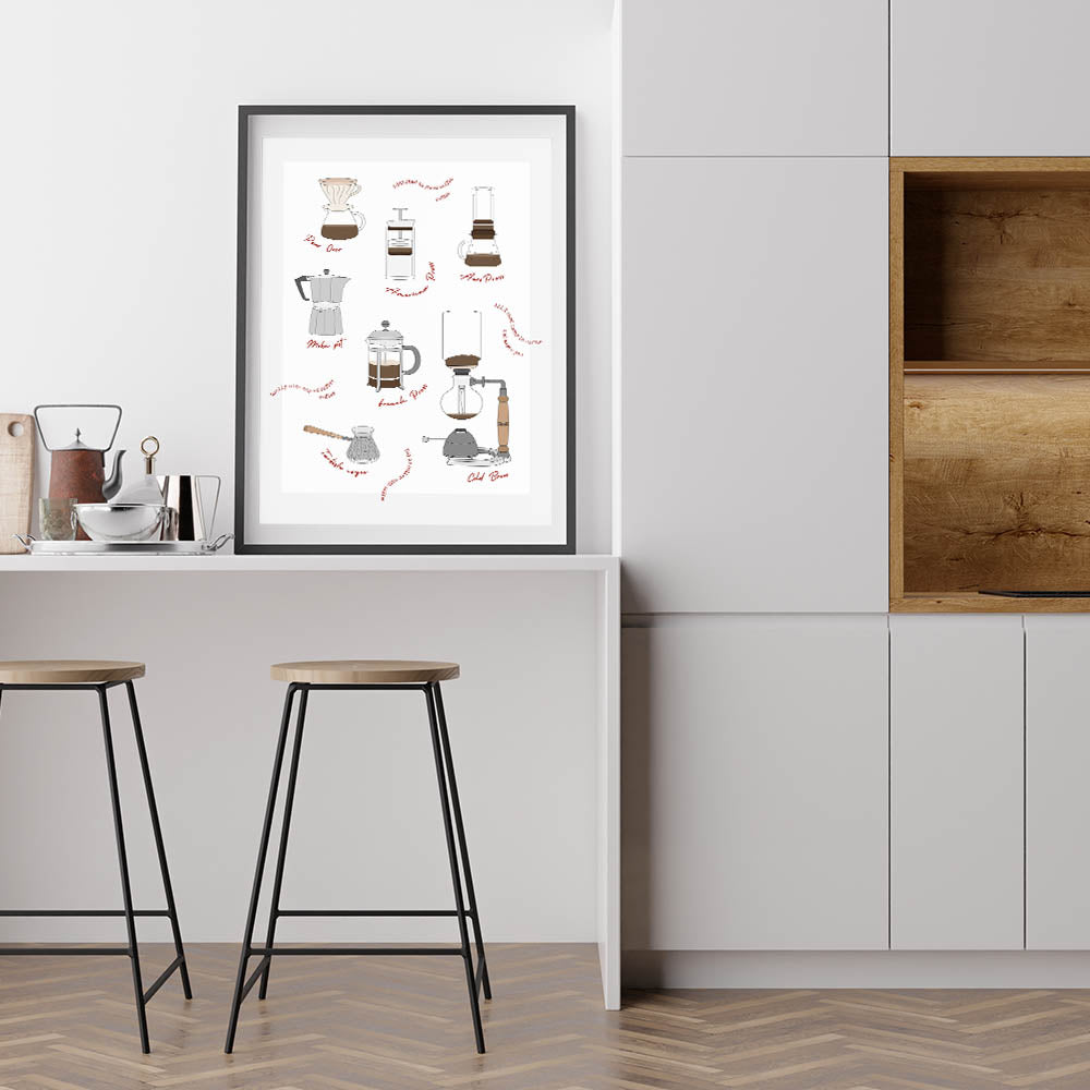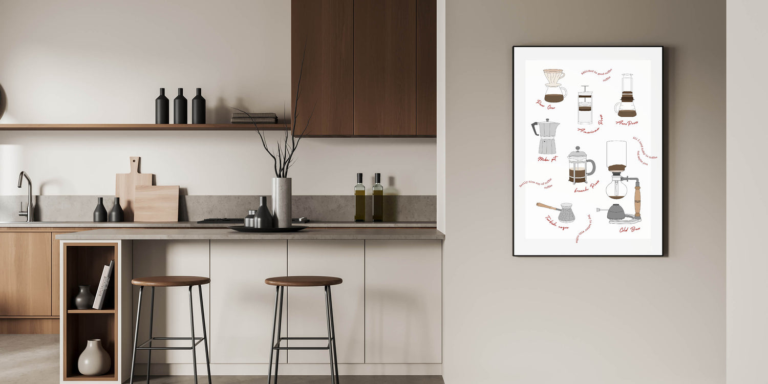 Upgrade your coffee corner with this modern coffee brewing guide wall art, featuring stylized illustrations of coffee-making methods like Pour Over, French Press, AeroPress, Moka Pot, and Cold Brew. Designed with neutral tones and elegant typography, this coffee wall art adds a sophisticated yet informative touch to any kitchen, café, or coffee bar.