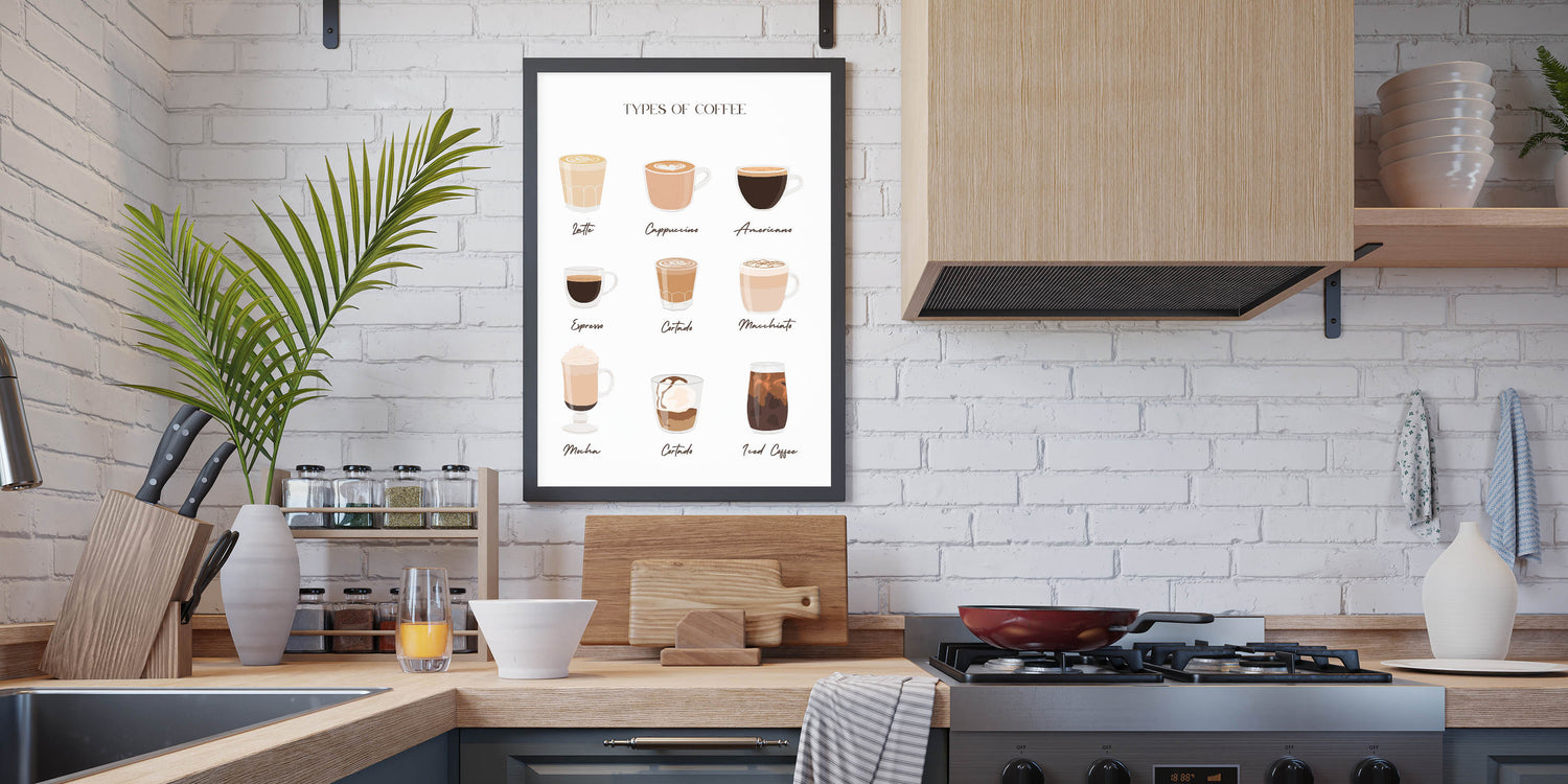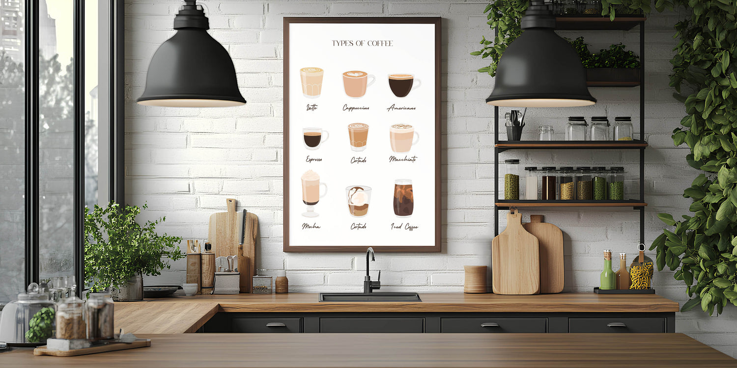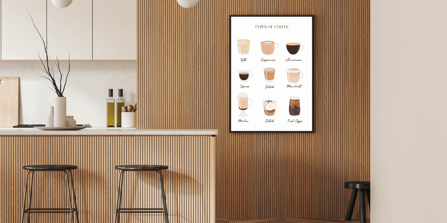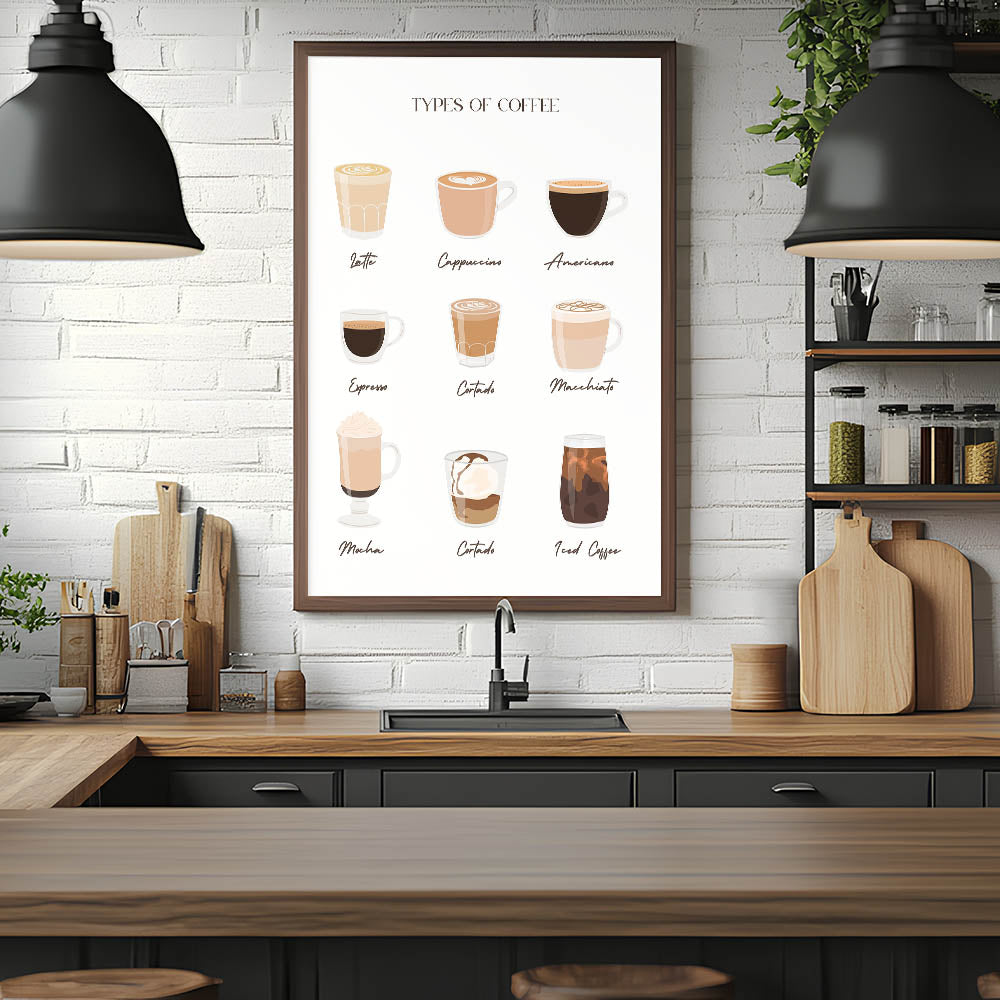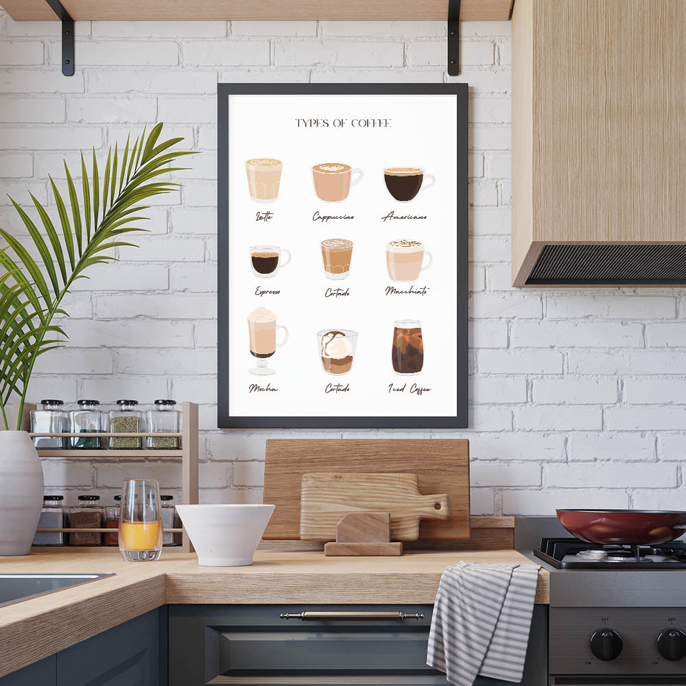 Celebrate your love for coffee with this modern coffee guide wall art, showcasing beautifully illustrated espresso, latte, cappuccino, macchiato, and more. The minimalist design and warm neutral tones make it a perfect addition to any kitchen, coffee bar, or café-inspired space. Whether you're a coffee enthusiast or simply want to add a stylish touch to your decor, this coffee wall art is a must-have.