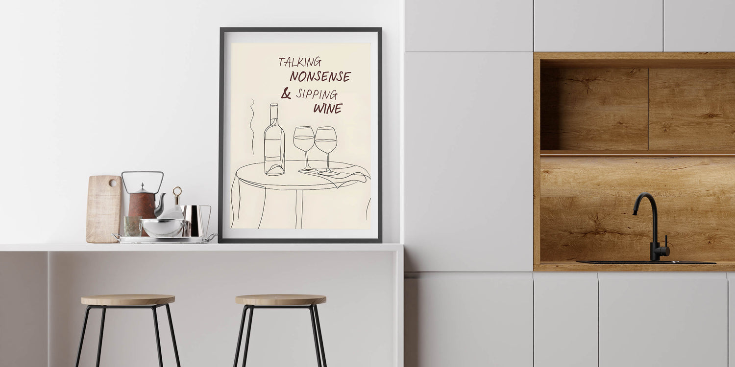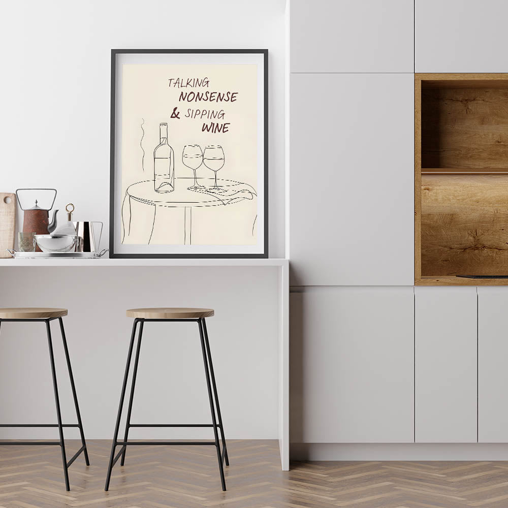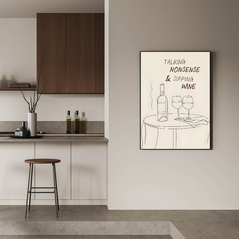 Unwind in style with this minimalist wine wall art, featuring a sleek one-line drawing of a wine bottle and two glasses on a table, paired with the playful phrase "Talking Nonsense & Sipping Wine." This artwork is perfect for bar wall art, kitchen wall decor, and wine art prints, creating a relaxed and inviting atmosphere. Whether you’re a wine enthusiast or love modern minimalist design, this beverage wall art is a must-have.