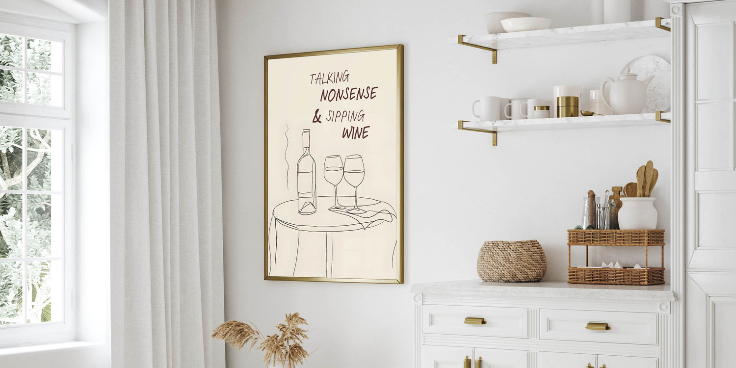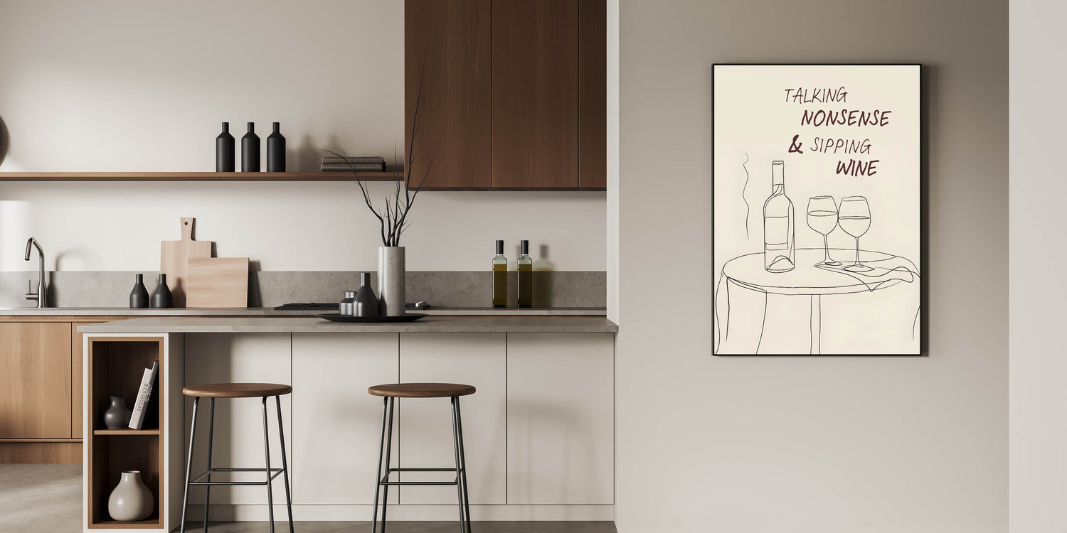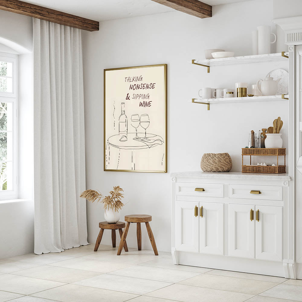 Unwind in style with this minimalist wine wall art, featuring a sleek one-line drawing of a wine bottle and two glasses on a table, paired with the playful phrase "Talking Nonsense & Sipping Wine." This artwork is perfect for bar wall art, kitchen wall decor, and wine art prints, creating a relaxed and inviting atmosphere. Whether you’re a wine enthusiast or love modern minimalist design, this beverage wall art is a must-have.