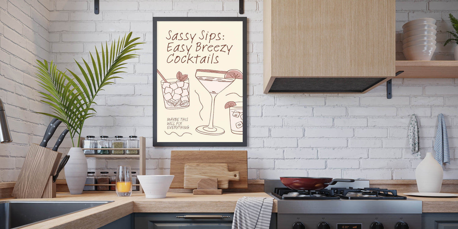 Add a playful and stylish touch to your space with this cocktail wall art, featuring minimalist, hand-drawn illustrations of refreshing drinks and the fun phrase, "Sassy Sips: Easy Breezy Cocktails." The modern beverage wall art design blends seamlessly with bar, kitchen, or lounge decor.