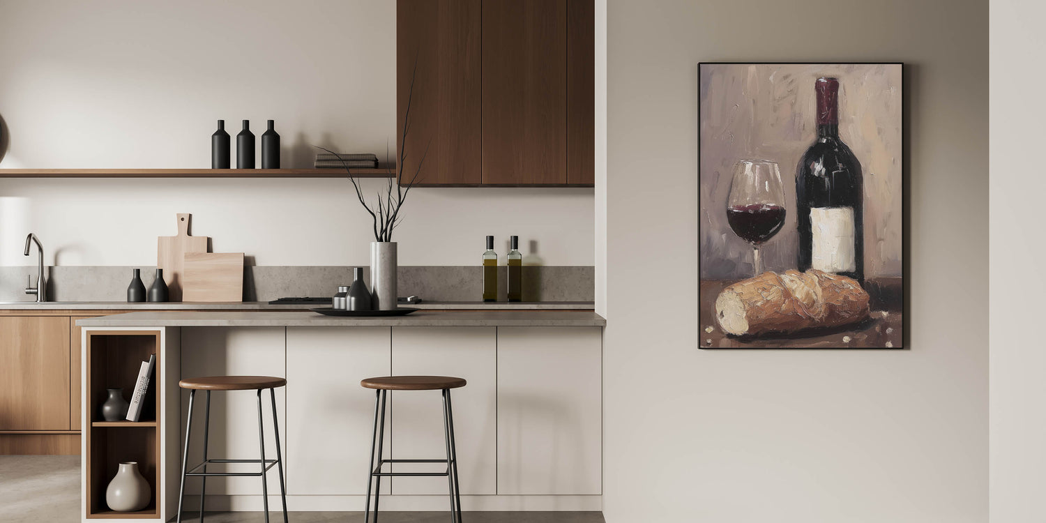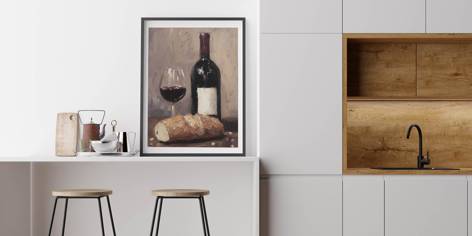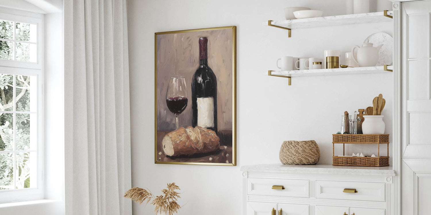 Wine & Bread Still Life Wall Art – Elegant Kitchen & Bar Decor