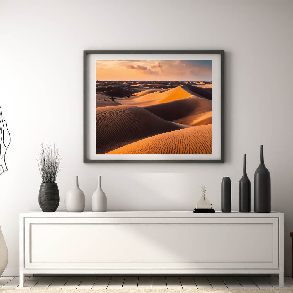 Bring the warmth and serenity of the desert into your space with this stunning golden sunset dune wall art. Capturing the tranquil beauty of sand dunes bathed in the soft glow of the setting sun, this artwork creates a peaceful and calming atmosphere, perfect for any room in your home or office. The rich, warm tones of the dunes and the gentle play of light and shadow evoke a sense of timeless beauty and quiet reflection.