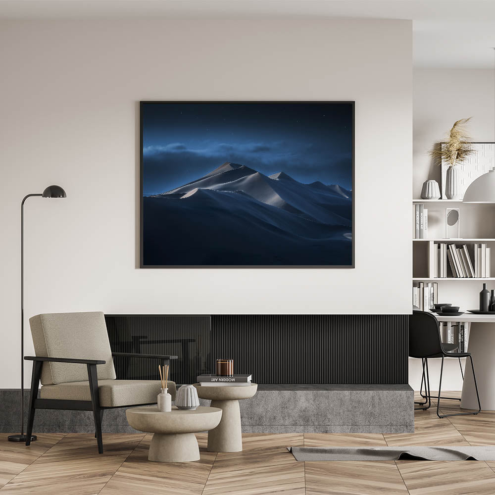 Enhance your living space with this stunning dune wall art, featuring a mesmerizing desert landscape captured under the serene light of the night sky. The beautiful contrast between the dark, rolling dunes and the soft moonlit sky creates a calming and peaceful atmosphere, making it a perfect addition to any room seeking a touch of tranquility.