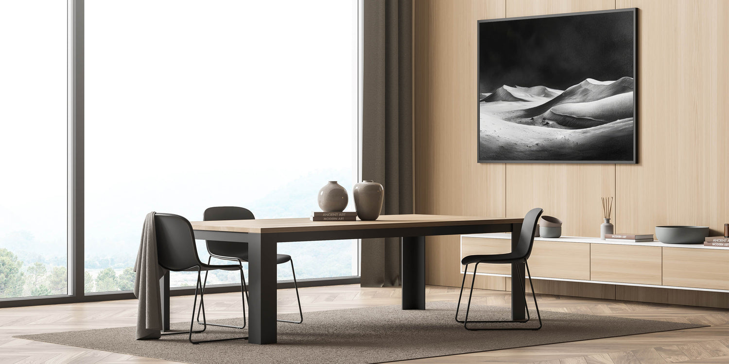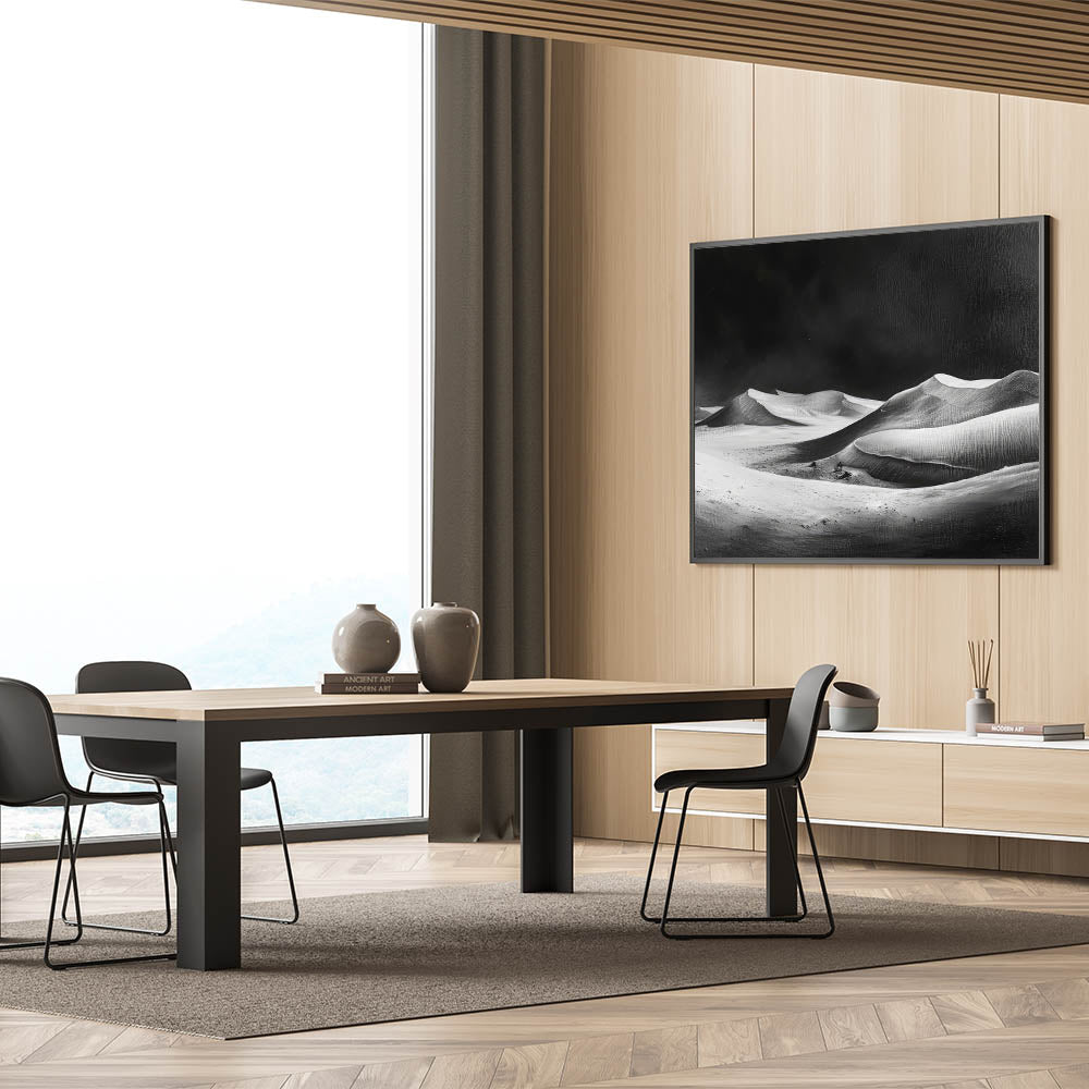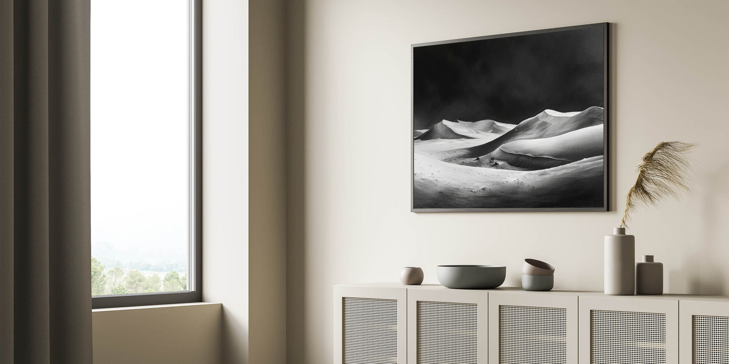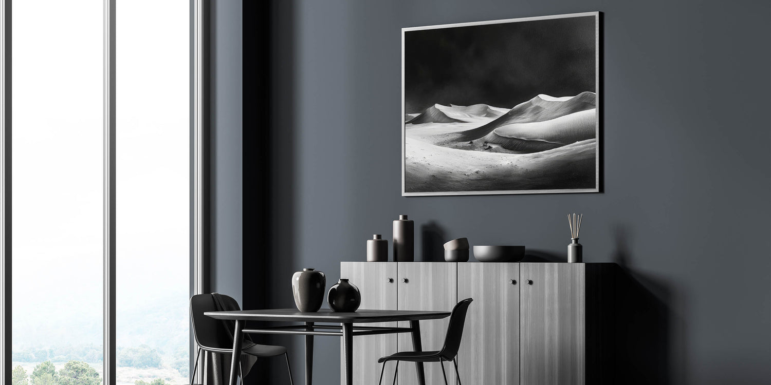 This unique sand dune artwork is perfect for those who appreciate minimalist design and the raw beauty of nature in its simplest form. The monochrome palette ensures it blends seamlessly with both modern and traditional interiors, making it a versatile addition to your art collection. Bring the dramatic elegance of the desert into your home with this captivating piece.