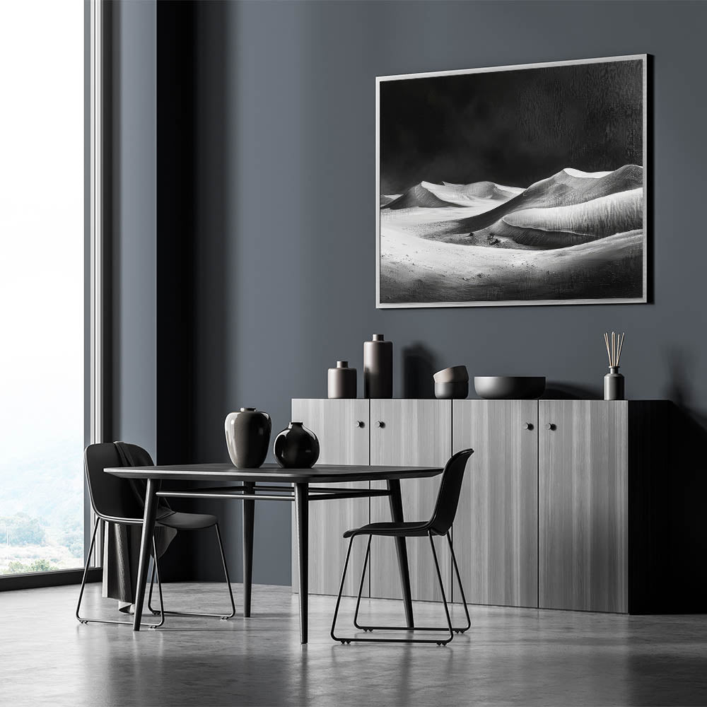Elevate your space with the dramatic beauty of this monochrome desert dune wall art, capturing the stark and powerful contrast of a black and white landscape. The bold interplay of light and shadow across the dunes creates a striking visual impact, making this artwork a perfect choice for those who appreciate the timeless elegance of monochrome art.