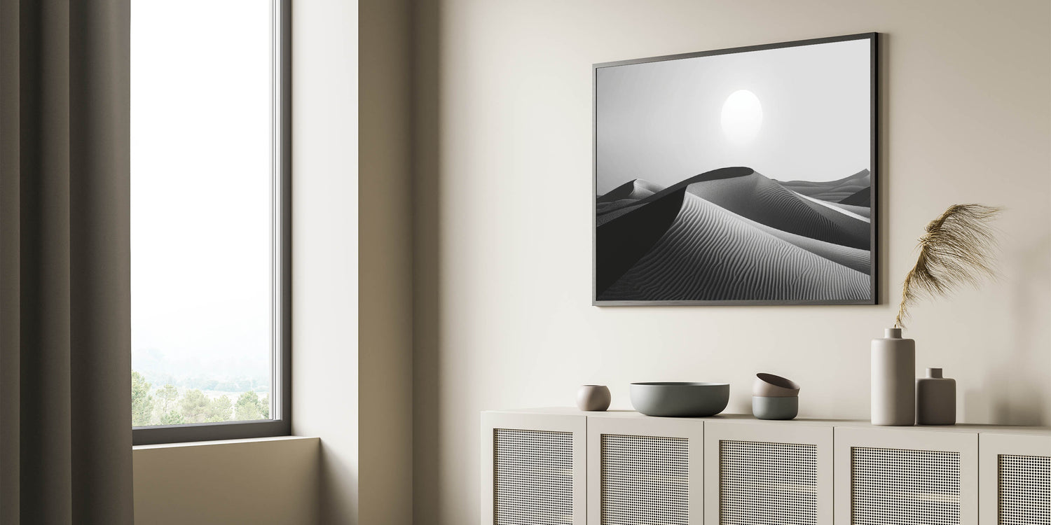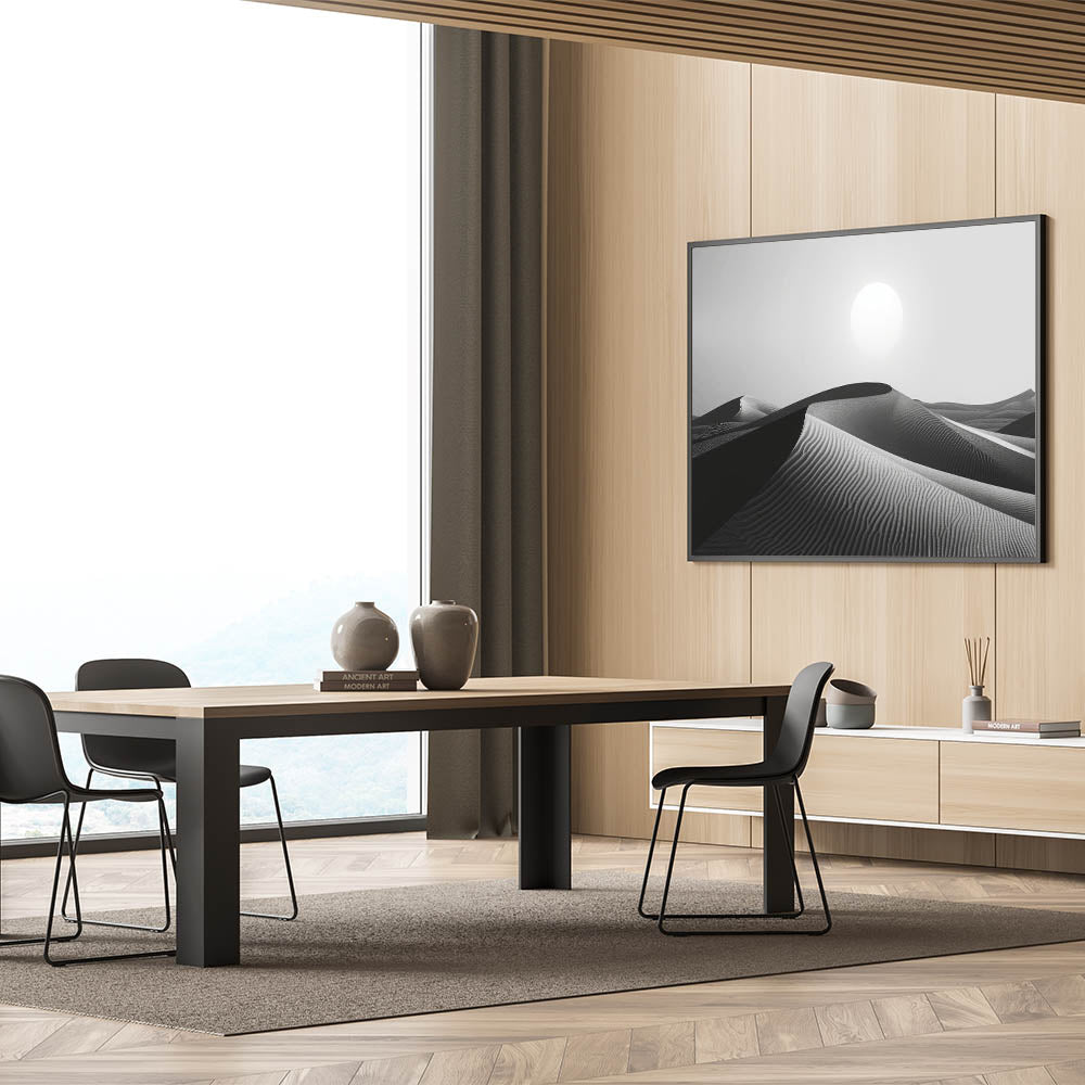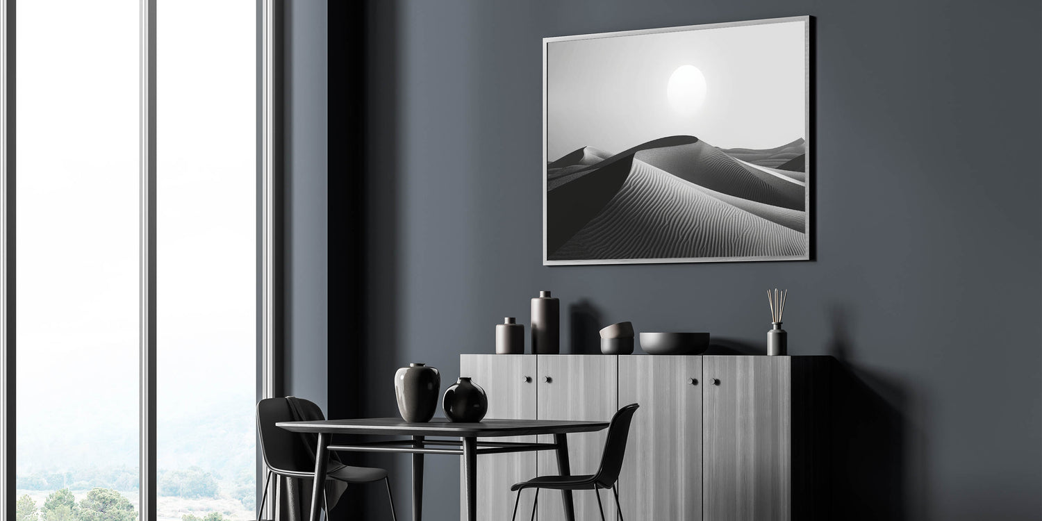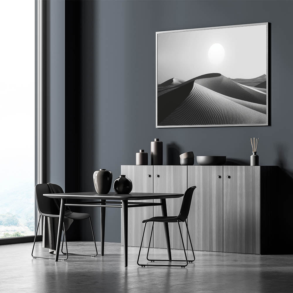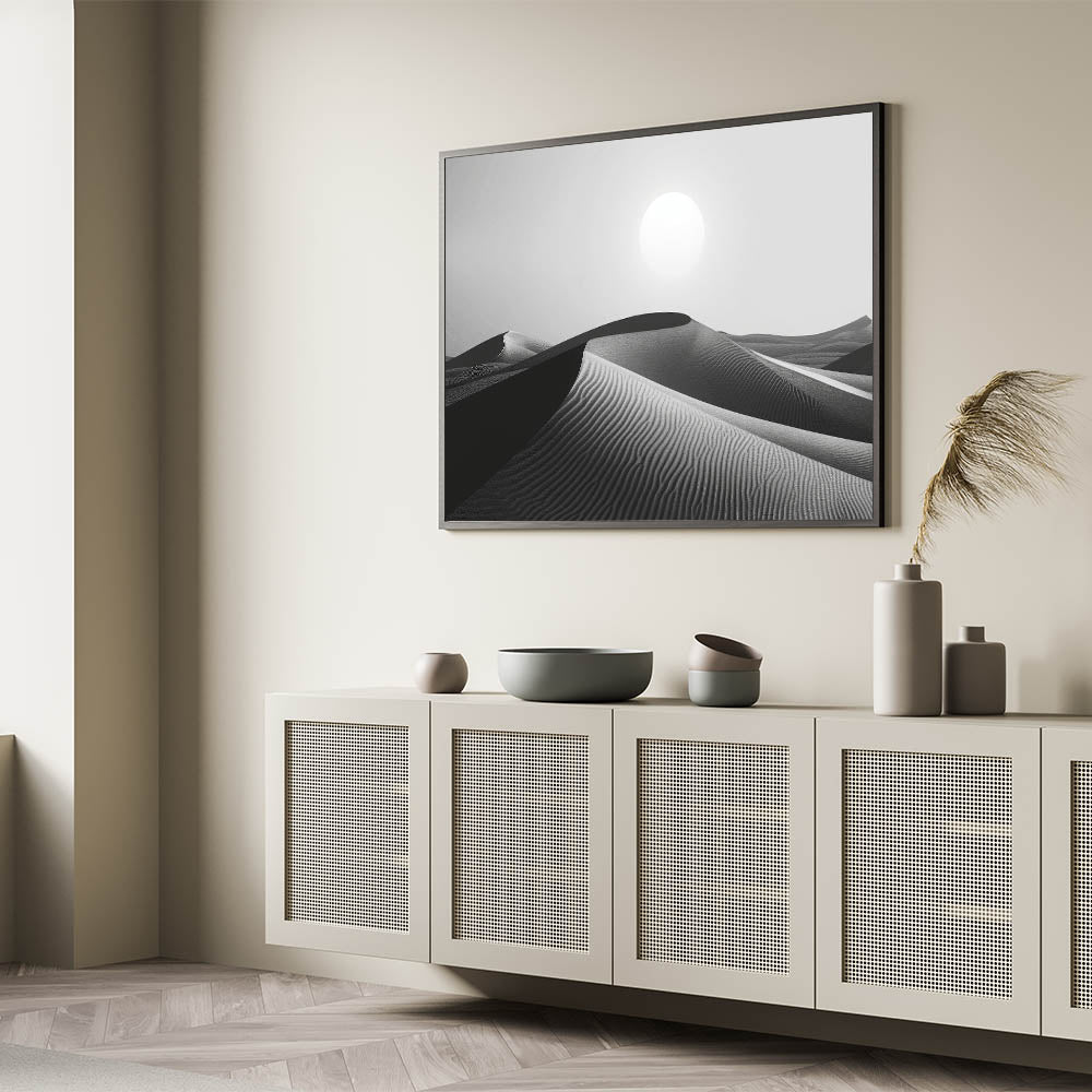 - High-quality monochrome dune wall art available in various formats, including stretched canvas, framed canvas, acrylic glass, and more.