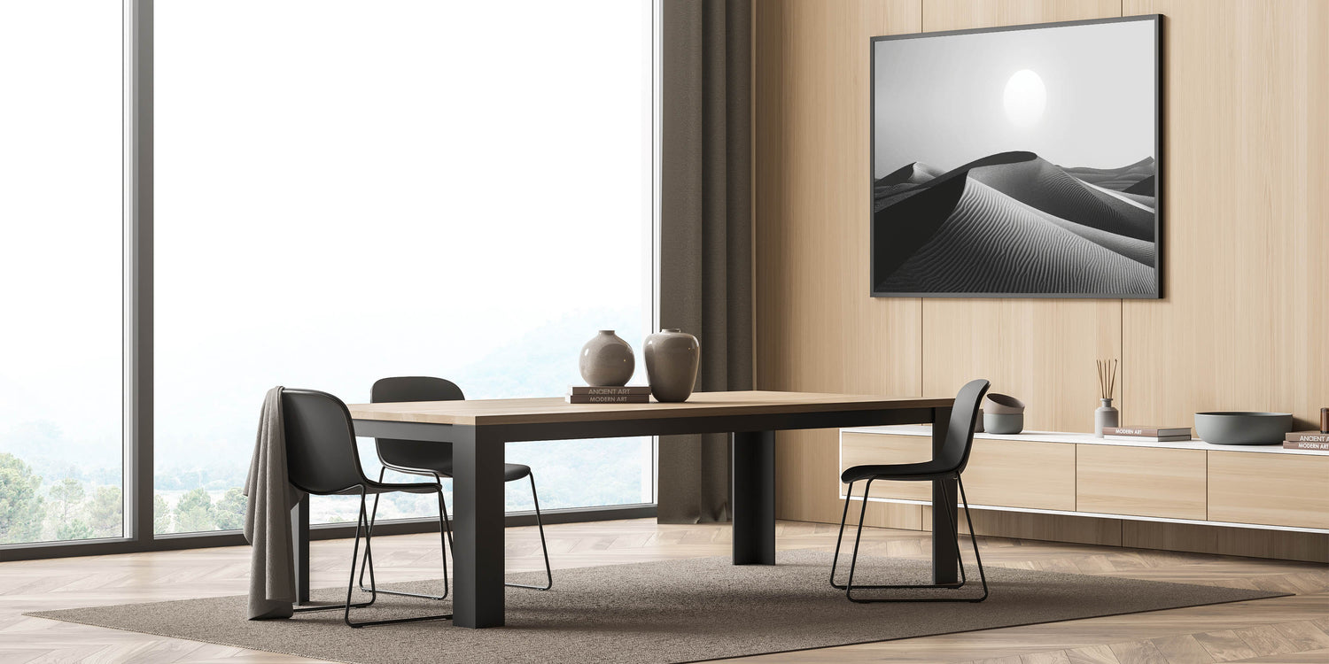 - Elegant black and white design that enhances the beauty of desert dunes with a contemporary twist.