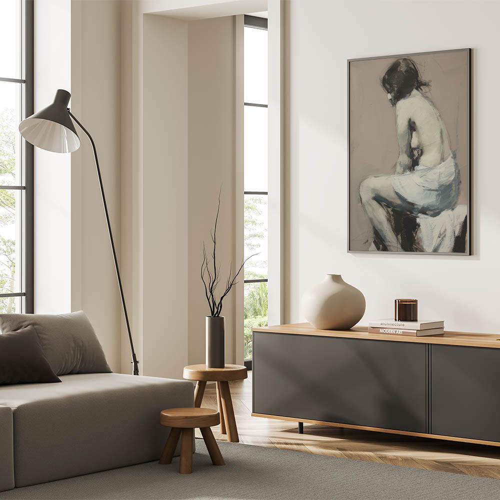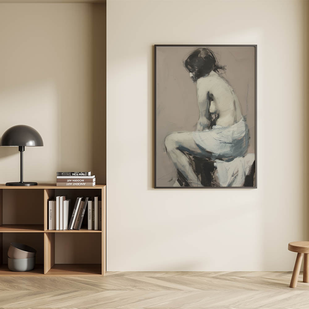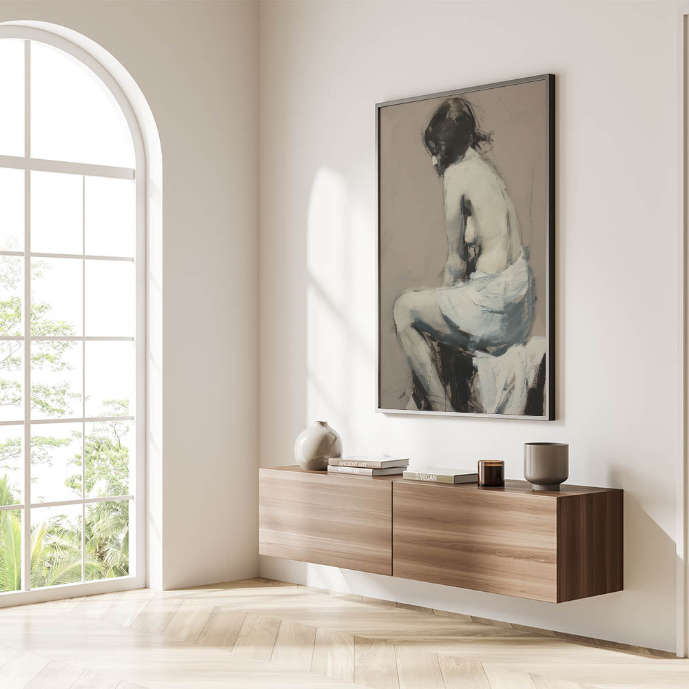 This abstract figurative canvas art presents a pensive female form captured in muted, neutral tones. The soft brushstrokes and bold contrasts create a striking yet serene composition that invites introspection and appreciation of the human figure. This stunning figurative canvas print is ideal for adding elegance and depth to modern or minimalist interiors.