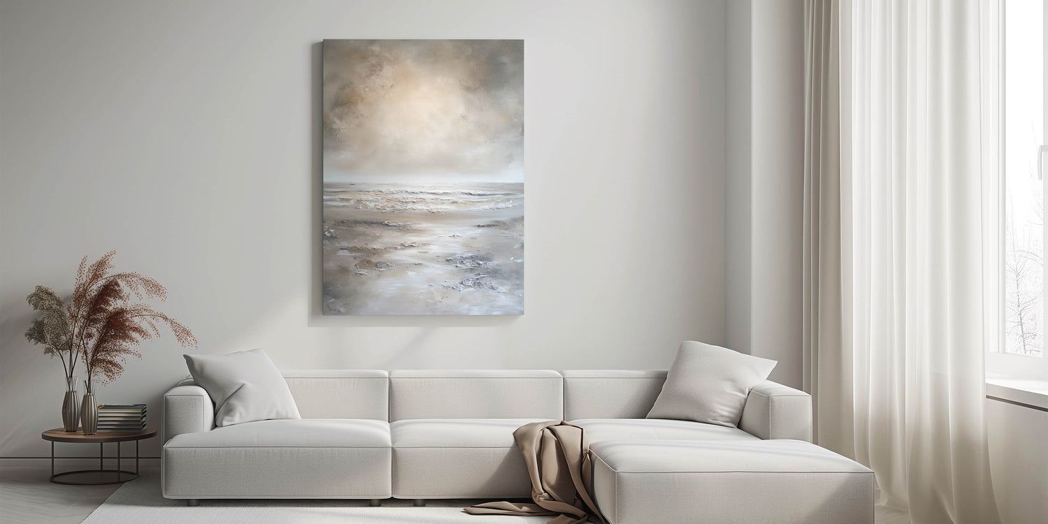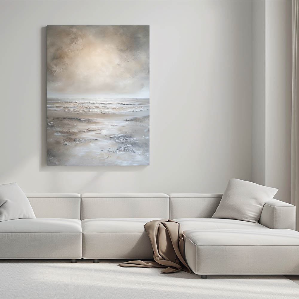 Transform your space into a haven of tranquility with this calming abstract seascape art. Featuring soft, neutral tones of beige, cream, and light gray, this minimalist landscape captures the essence of a quiet seashore. Its subtle textures and smooth color transitions evoke a sense of peace and relaxation, making it a perfect addition to any modern, minimalist, or coastal-inspired decor.