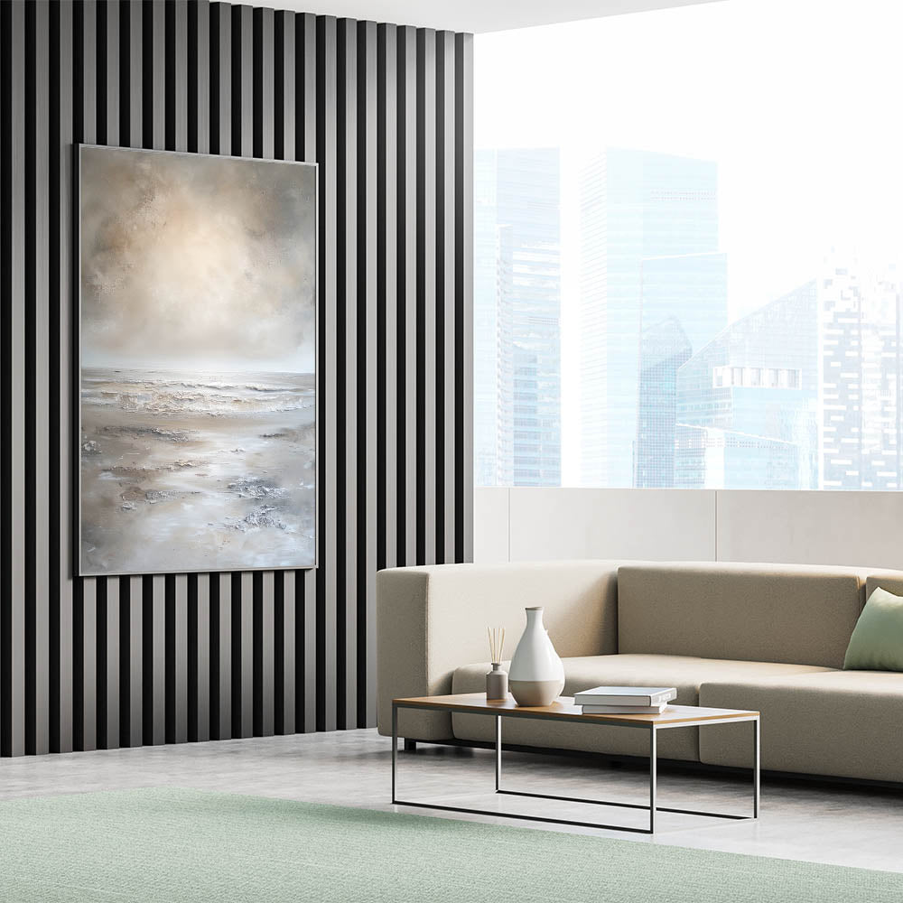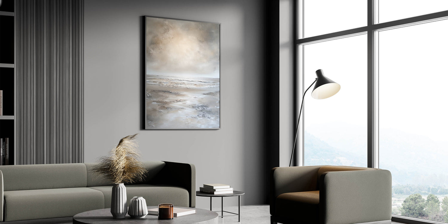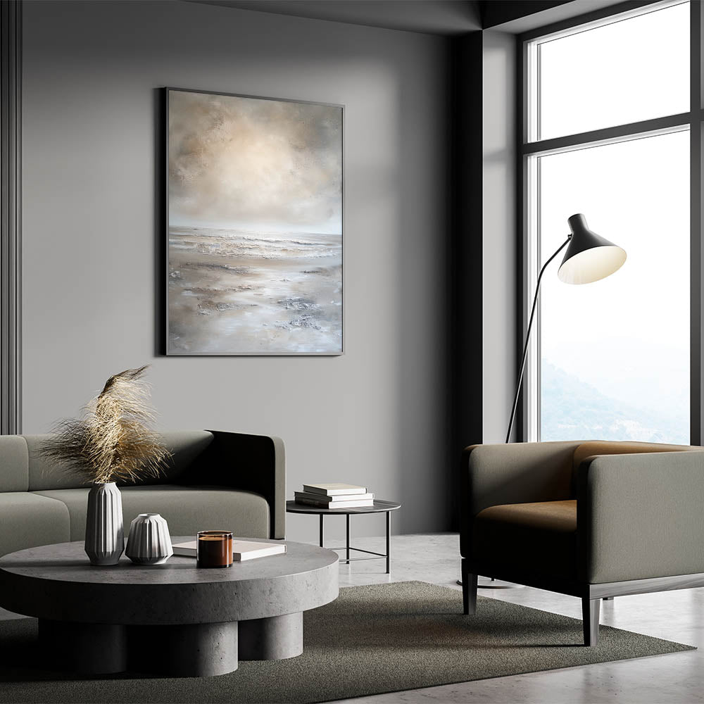This abstract landscape is ideal for those looking to bring a peaceful ambiance into their living spaces. Its neutral hues and minimalist design make it versatile, enhancing any room with a touch of natural serenity.