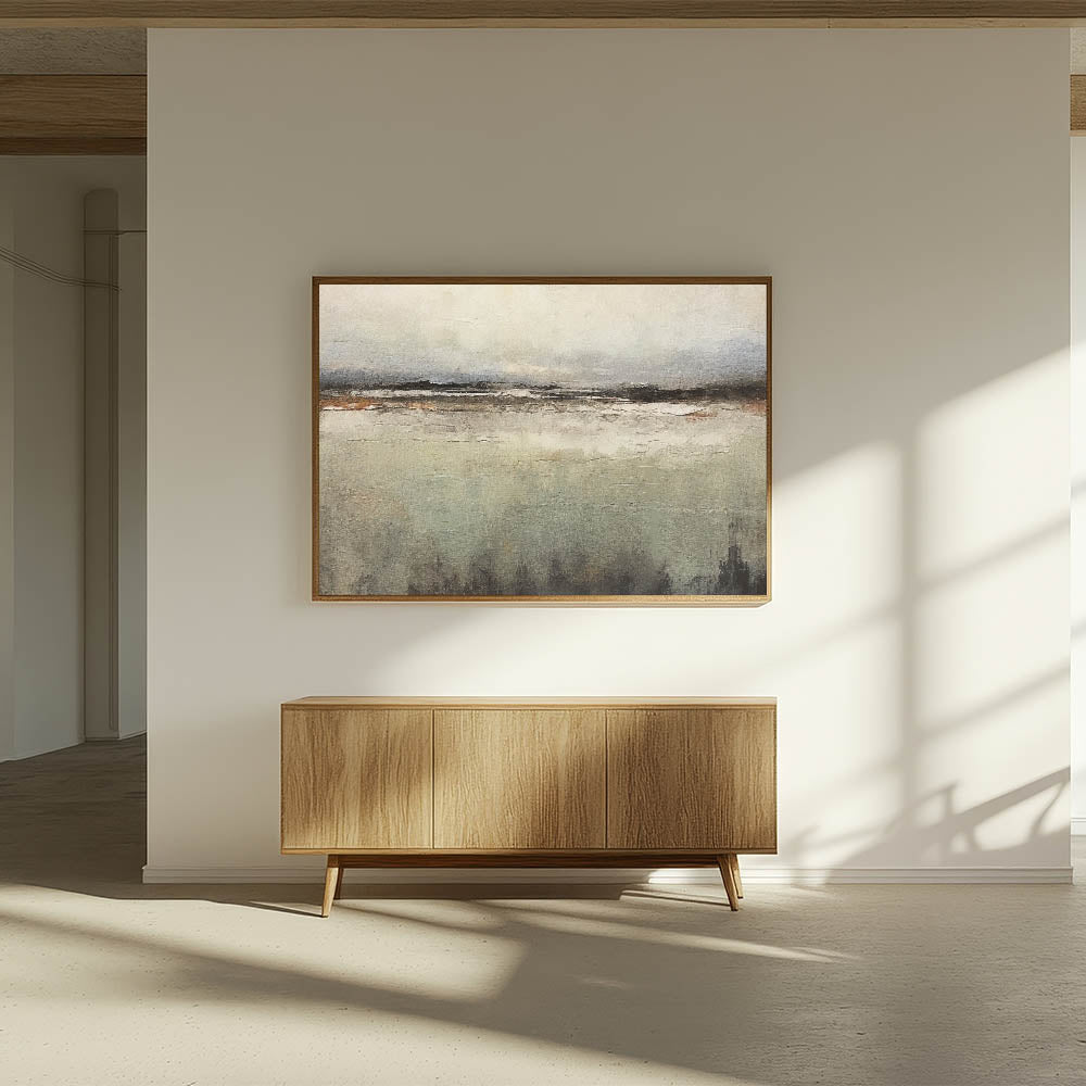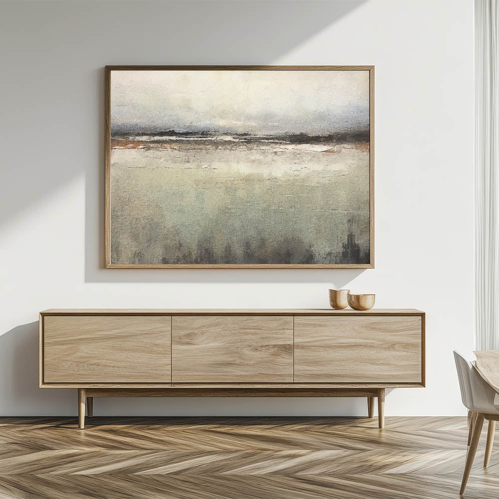 Embrace the calming effect of nature with this modern landscape abstract featuring a blend of neutral tones and earthy textures. The muted greens, grays, and hints of soft browns create a soothing scene, reminiscent of a misty morning over tranquil water. Perfect for those who appreciate subtle elegance, this unique landscape art print brings a serene touch to your decor.