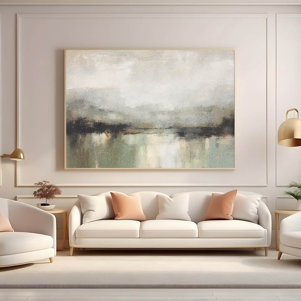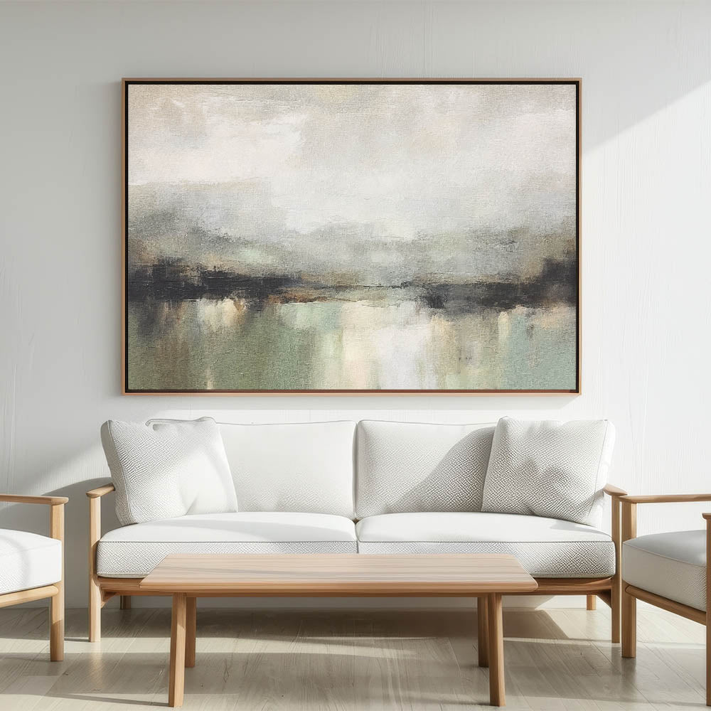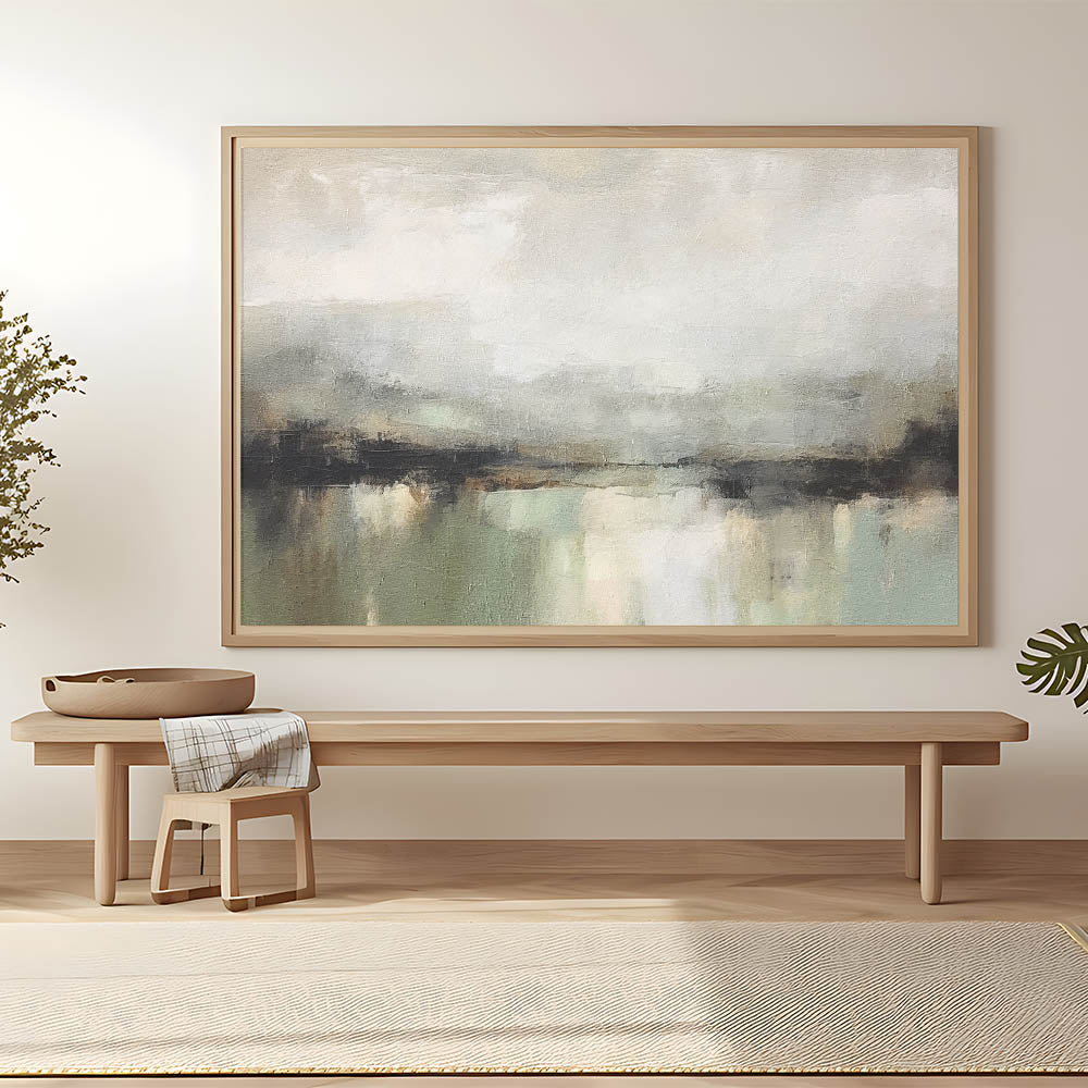 This soft misty landscape art piece features a tranquil, neutral-toned scene that brings a sense of calm and depth to any space. With shades of beige, gray, and muted greens, this abstract landscape captures the ethereal beauty of mist settling over water, creating an inviting atmosphere. Ideal for minimalist and contemporary interiors, this artwork adds a peaceful, nature-inspired element to your decor.