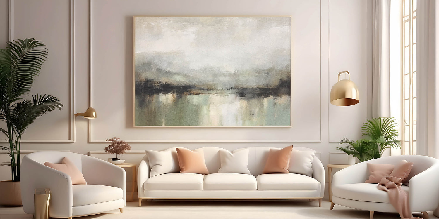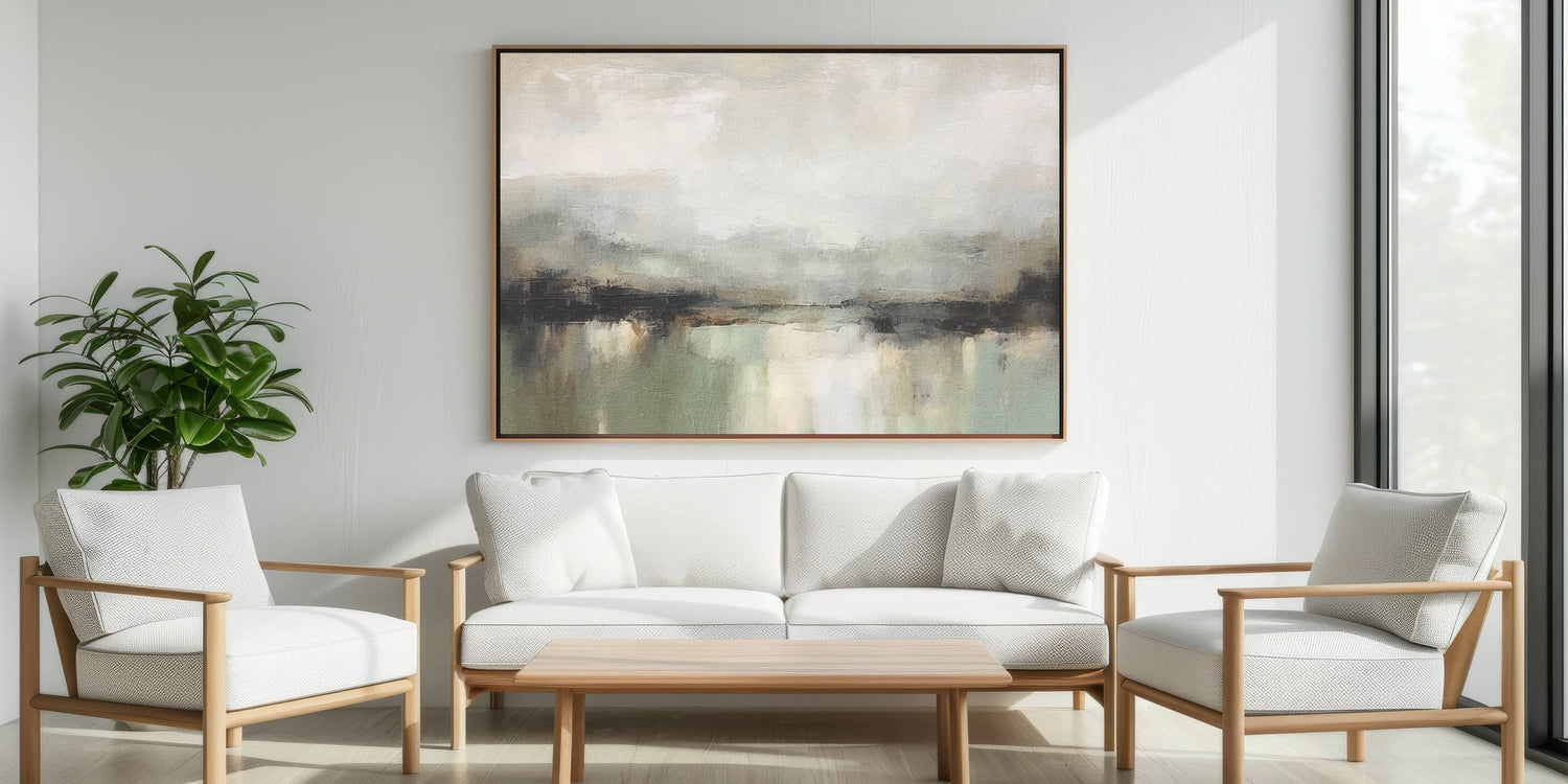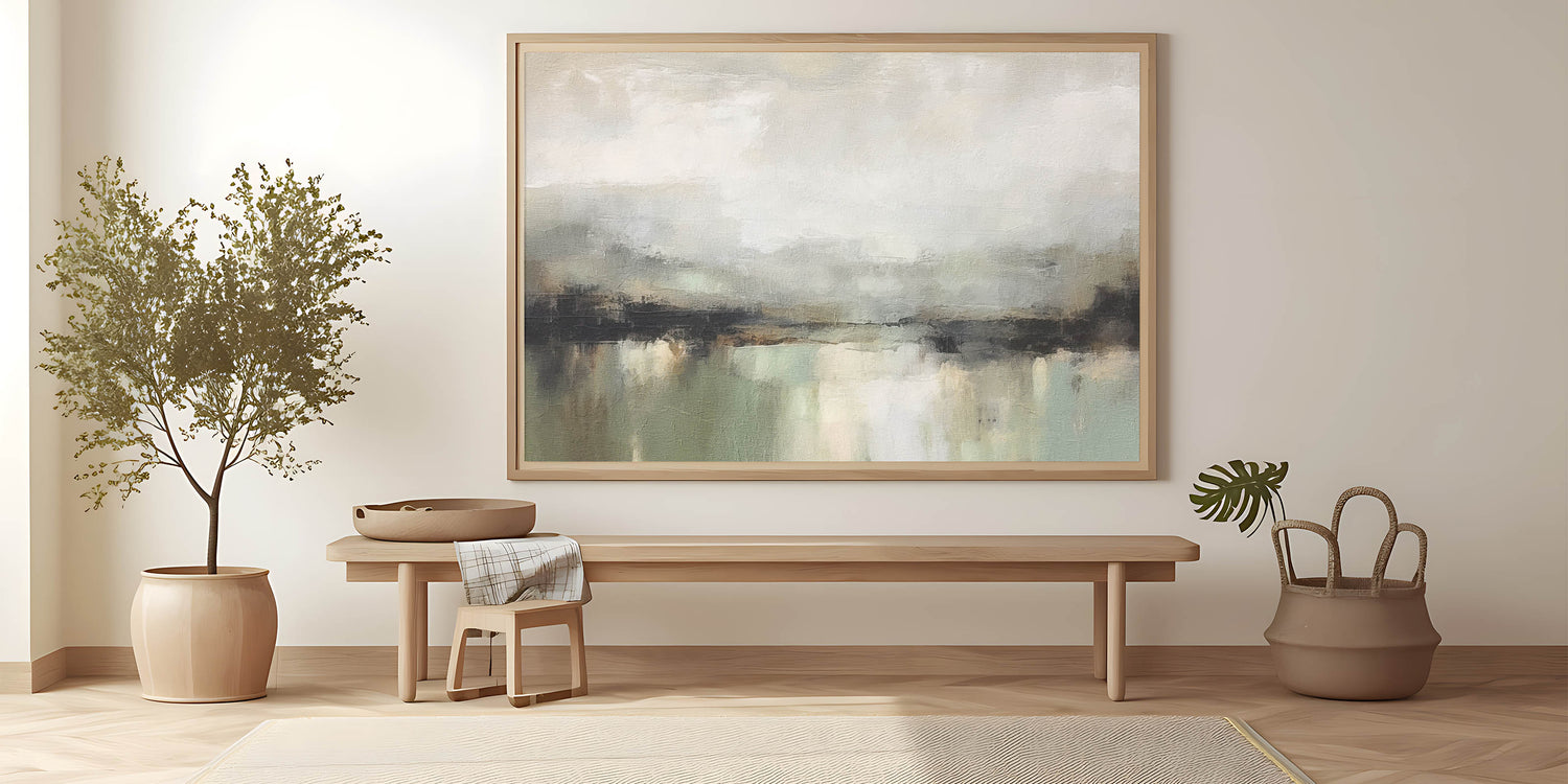 This soft misty landscape art piece features a tranquil, neutral-toned scene that brings a sense of calm and depth to any space. With shades of beige, gray, and muted greens, this abstract landscape captures the ethereal beauty of mist settling over water, creating an inviting atmosphere. Ideal for minimalist and contemporary interiors, this artwork adds a peaceful, nature-inspired element to your decor.