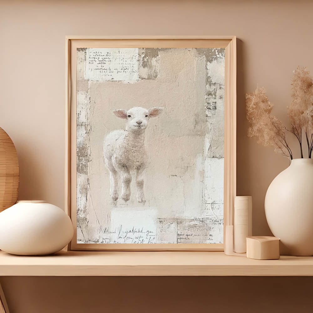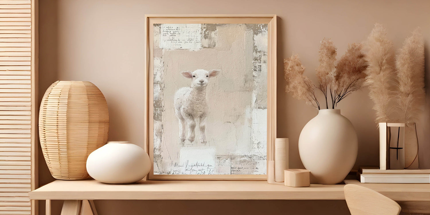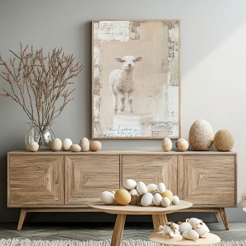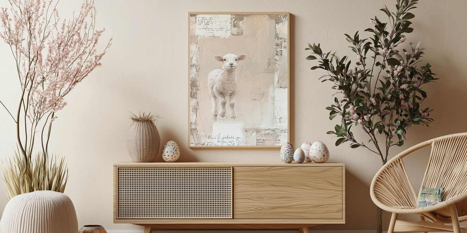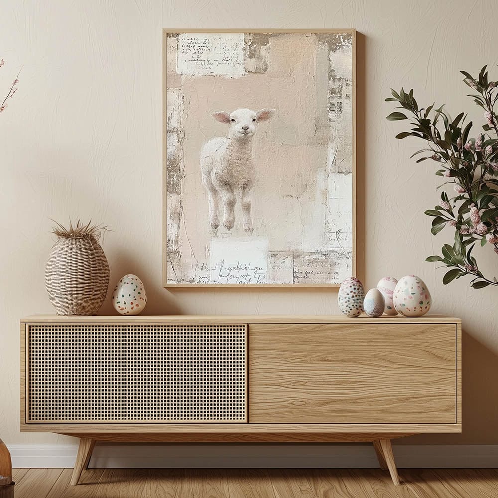 Celebrate the essence of spring with this charming Easter wall art featuring an adorable lamb. Set against a soft, textured background in warm beige and blush hues, this Easter canvas print captures the innocence and joy of the season. The gentle color palette and serene design make it an ideal addition to your Easter decorations, adding a touch of whimsy and warmth to your home decor.
