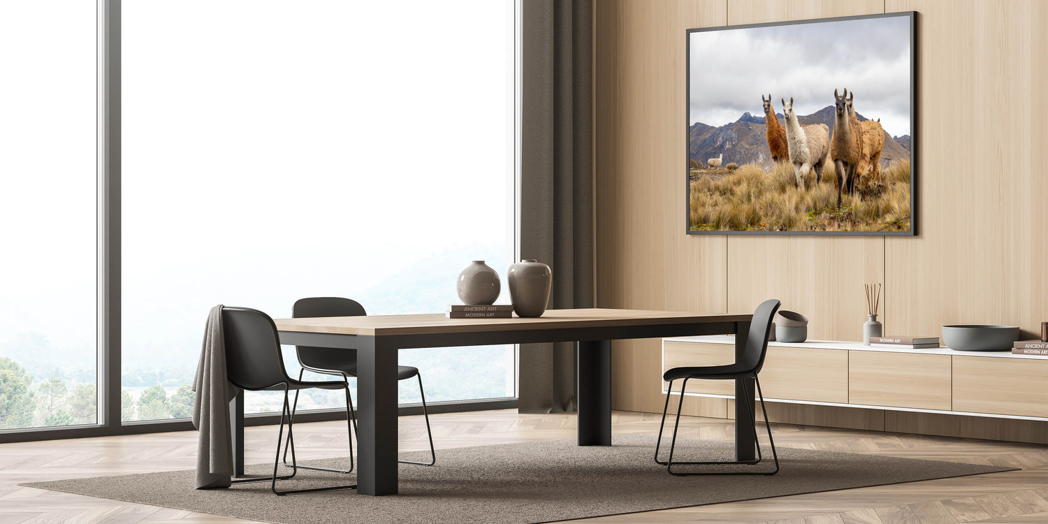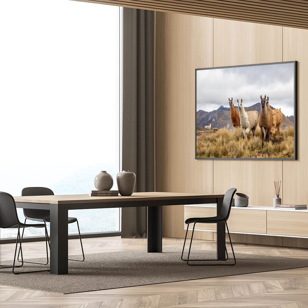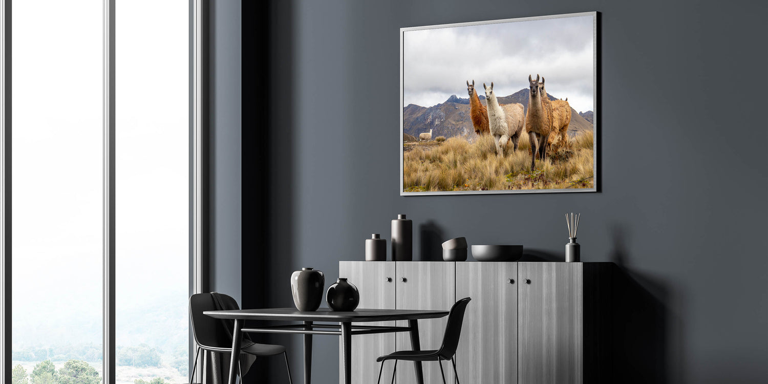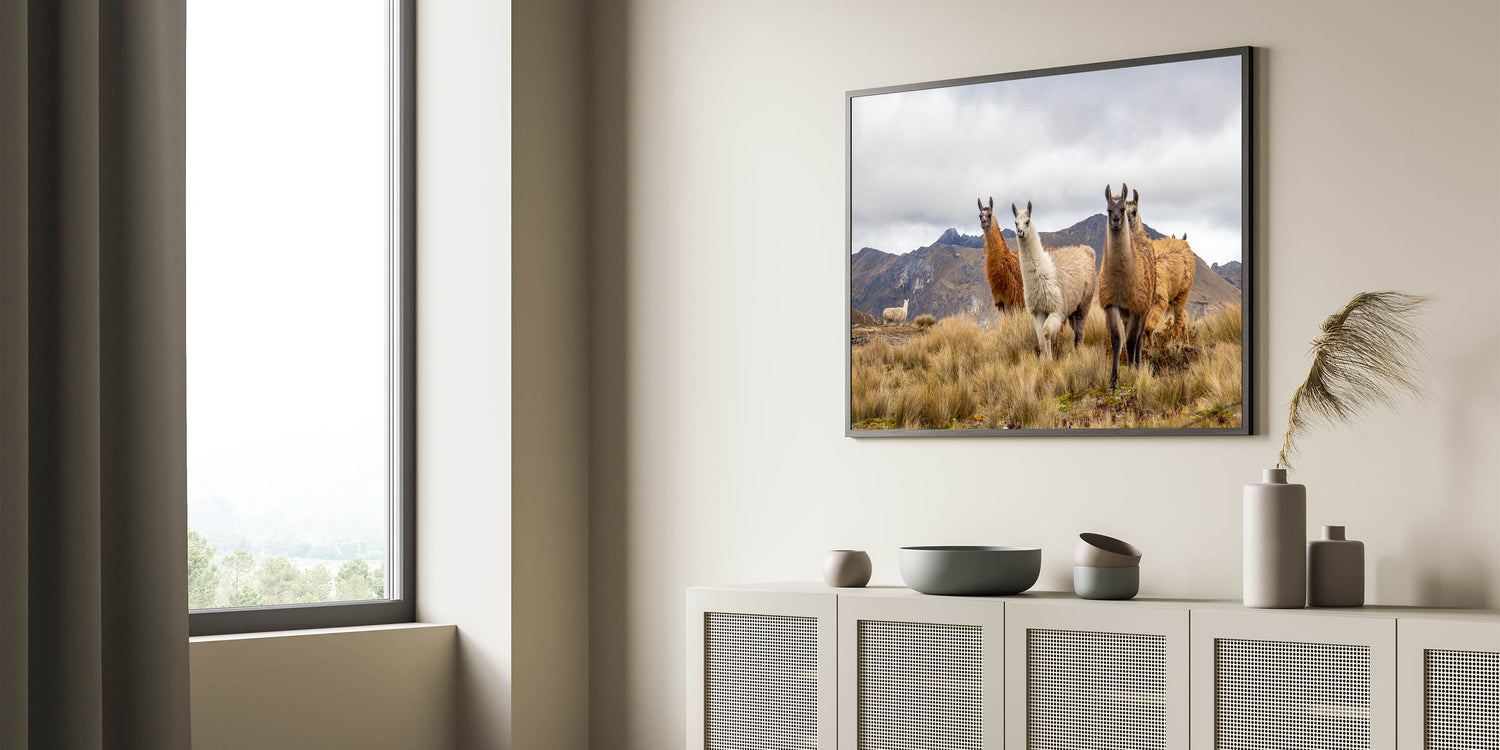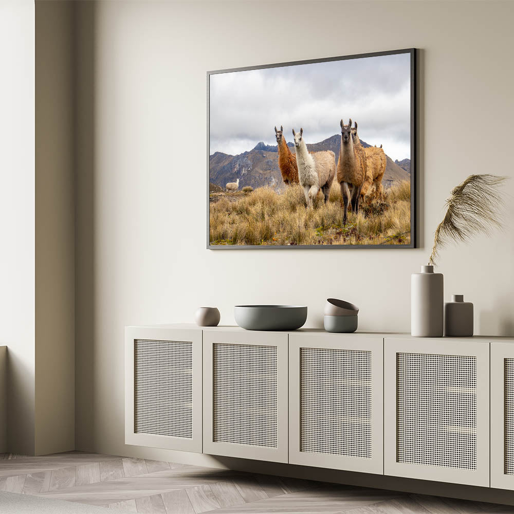 This stunning photography print captures the heart of Ecuador’s natural beauty with a group of llamas standing proudly against the majestic Andes Mountains. Perfect for animal lovers and those enchanted by South American landscapes, this artwork brings a sense of nature’s tranquility and the iconic animals of the region into your home. The earthy tones of the llamas’ fur contrast beautifully with the rugged mountain backdrop, making this piece ideal for adding warmth and a natural touch to any space.