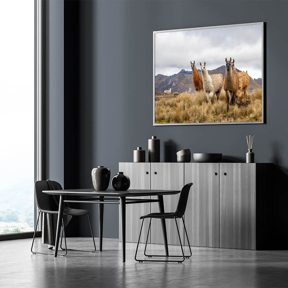 • High-quality Ecuador landscape art prints featuring llamas in their natural habitat with the Andes in the background