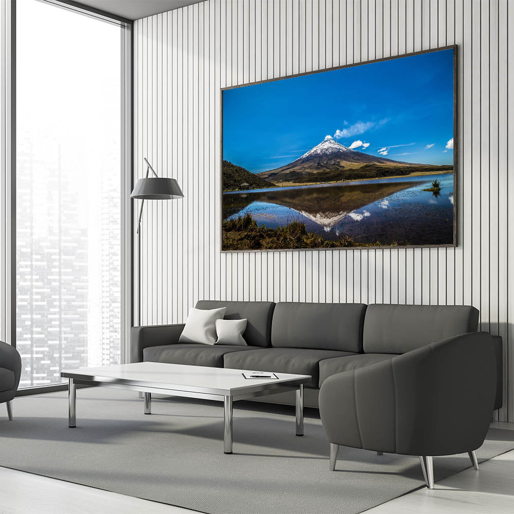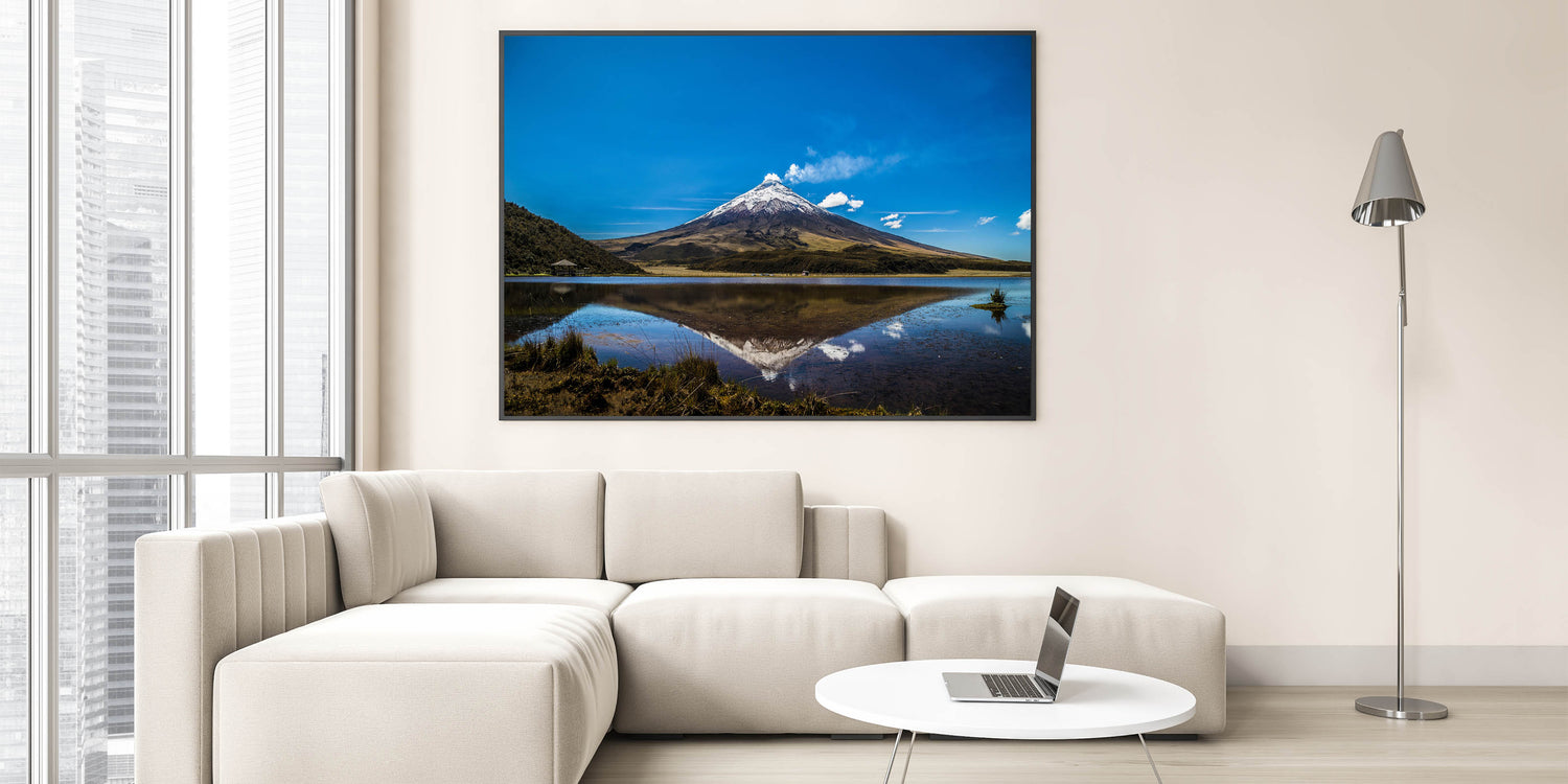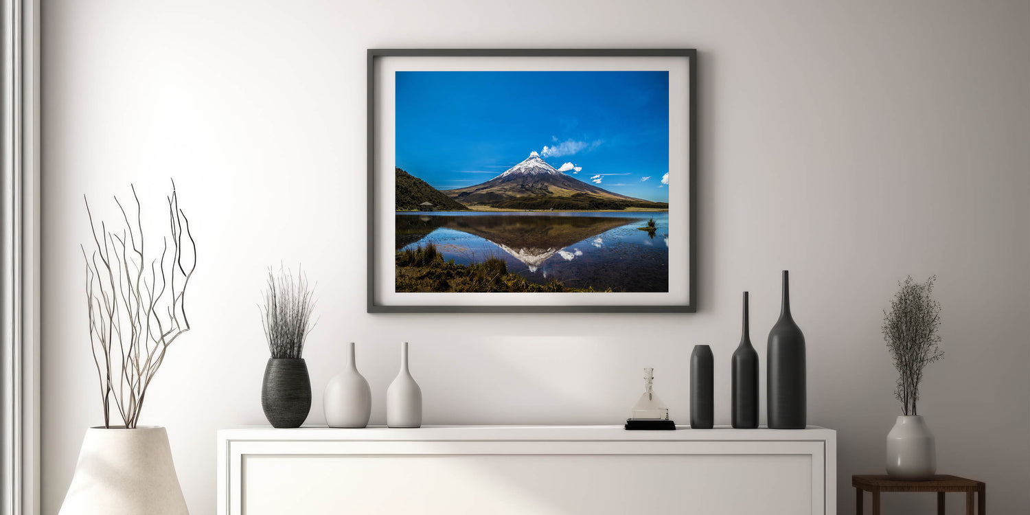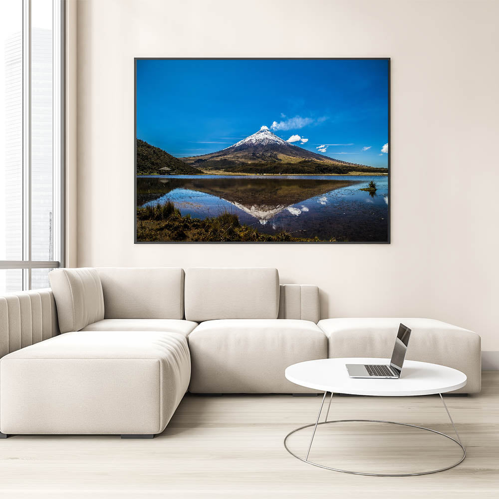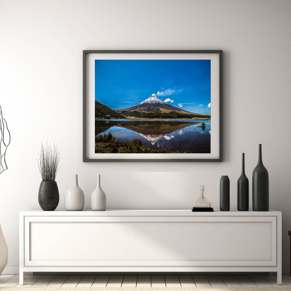 Experience the majestic beauty of Ecuador’s Cotopaxi Volcano with this breathtaking photographic print. The towering, snow-capped volcano is perfectly mirrored in the serene waters below, creating a striking visual symmetry. This artwork showcases the dramatic contrast between the deep blue sky, the white volcanic peak, and the calm, reflective lake. Perfect for nature lovers and those who appreciate South American landscapes, this print brings the tranquility and grandeur of Ecuador’s iconic Cotopaxi Volcano into your space.
