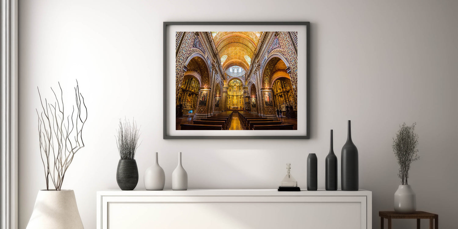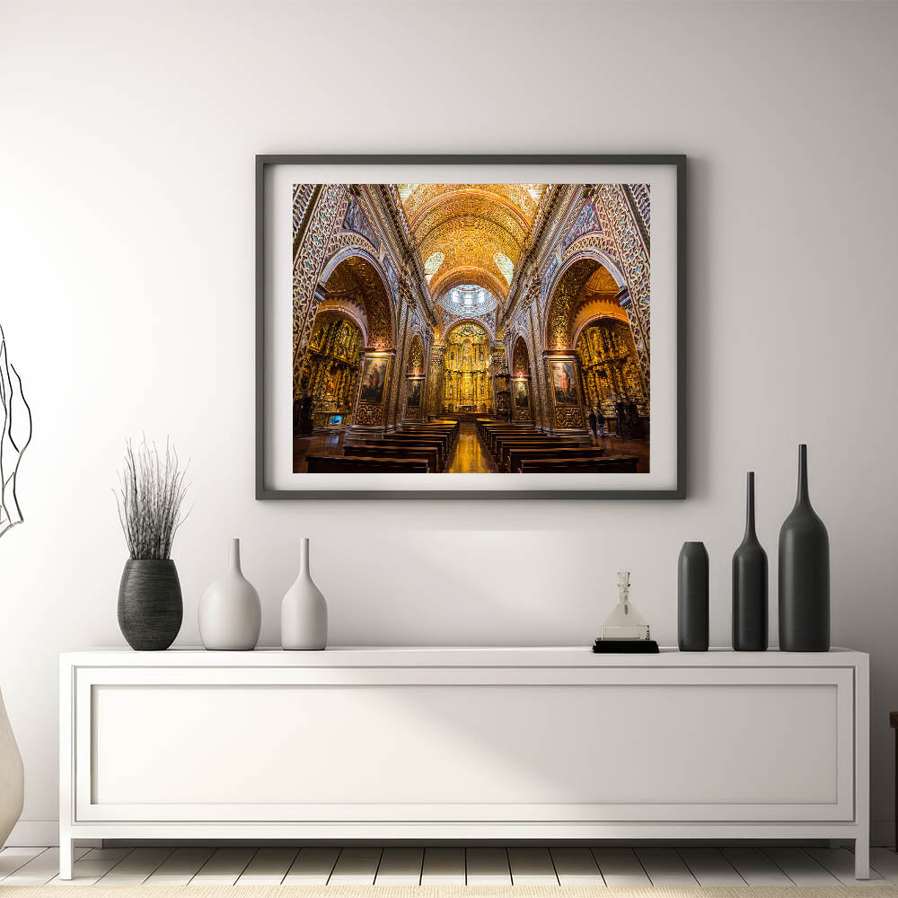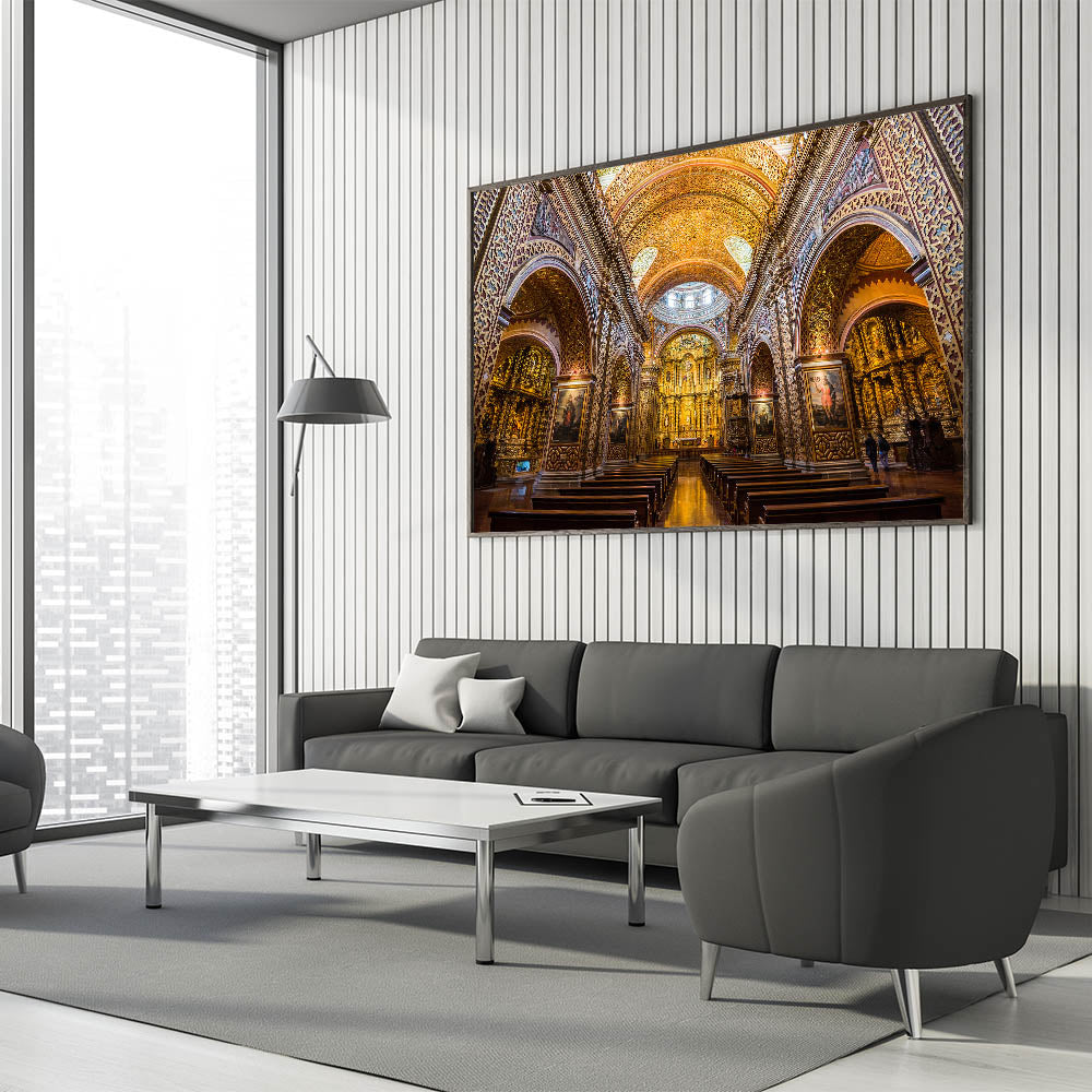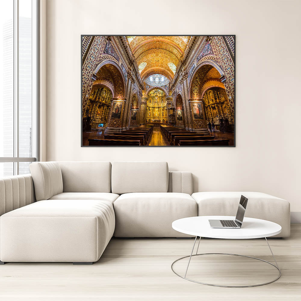 Bring the breathtaking grandeur of the Church of the Society of Jesus in Quito, Ecuador, into your home with this luxurious wall art. Known for its stunning Baroque architecture and intricate gold details, this Ecuadorian landmark is a masterpiece of craftsmanship and spiritual beauty. This artwork captures the ornate details of the church’s lavish interior, from its golden arches to its detailed altarpiece, perfect for adding elegance and historical depth to your decor.