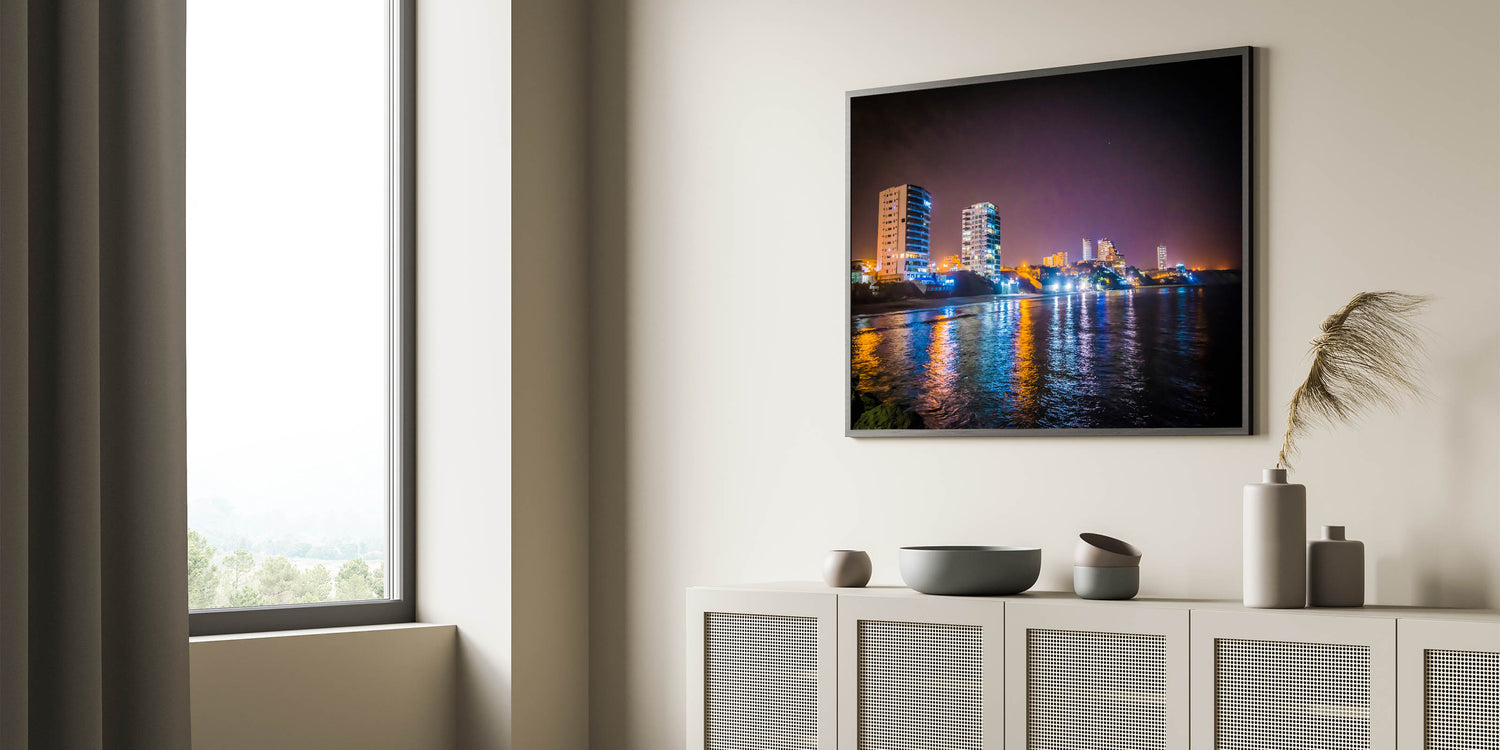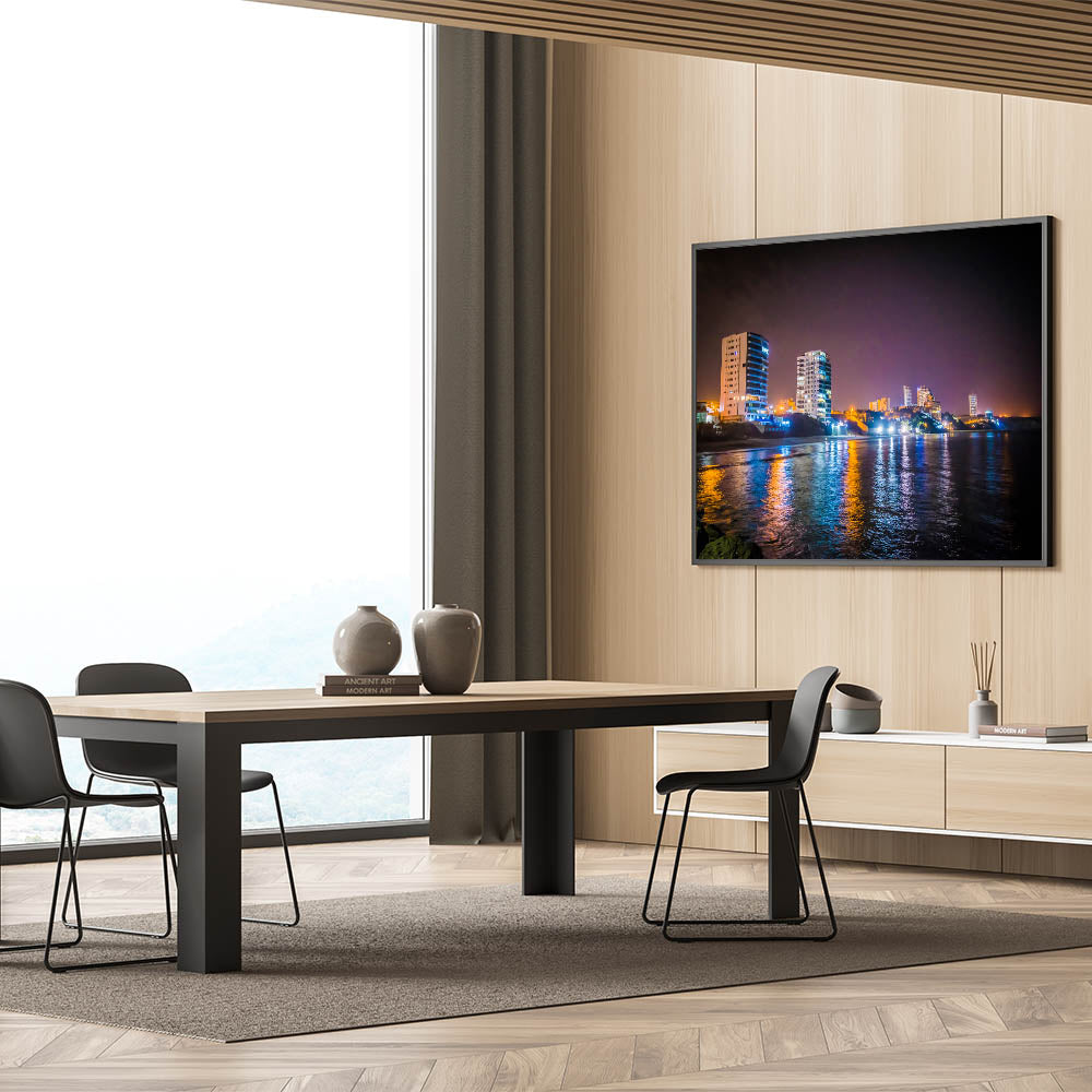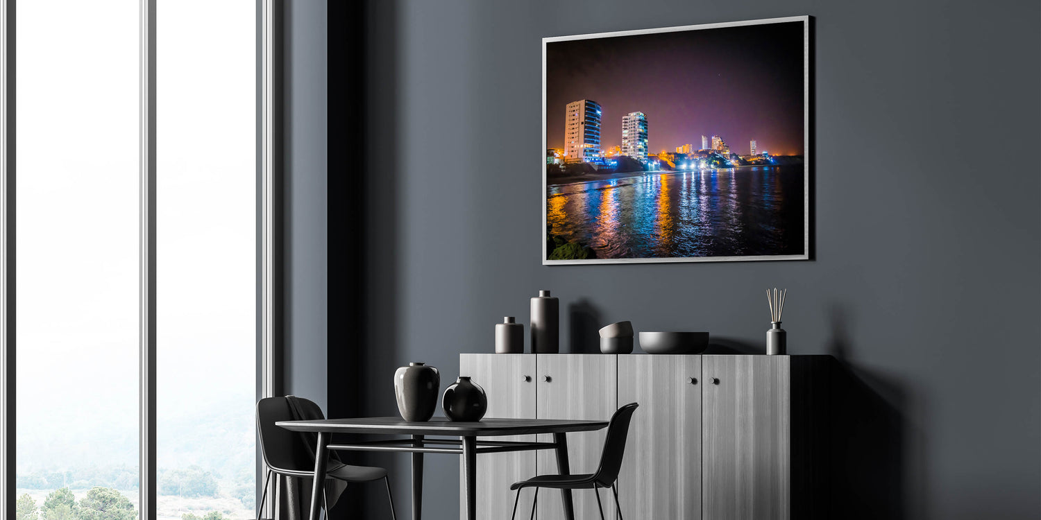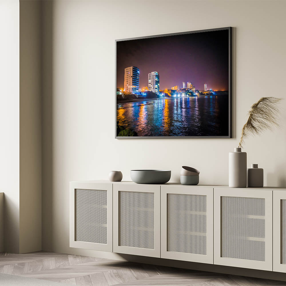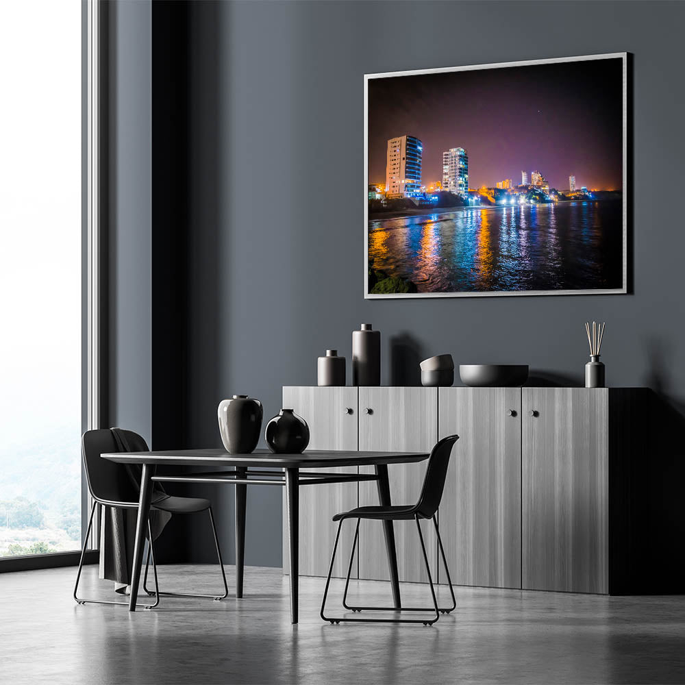 Bring the calm yet vibrant essence of Ecuador’s coastal city lights into your home with this beautiful piece of South American wall art, perfect for those who appreciate modern cityscapes and serene water reflections.