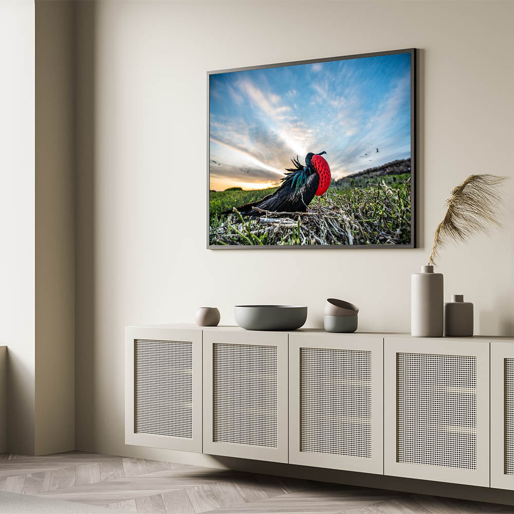 Capture the stunning beauty of Galapagos wildlife with this dramatic wall art featuring a frigatebird in full display. The bird's vibrant red throat pouch against the lush greens and expansive sky creates a striking contrast, making this artwork a perfect centerpiece for any room. This Galapagos wall art brings the rare beauty of the islands' wildlife into your home, ideal for bird lovers and nature enthusiasts.