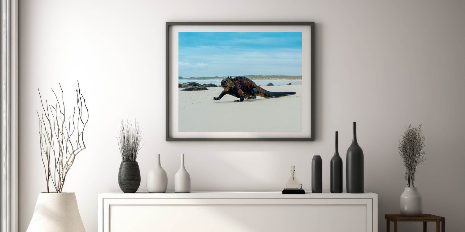 Experience the wild beauty of the Galapagos Islands with this captivating wall art featuring a marine iguana on a pristine beach. This Galapagos wall art captures the unique combination of sandy shores and wildlife, showcasing the remarkable marine iguana in its natural habitat. With its bold textures and natural colors, this piece will bring an adventurous yet calming vibe to any space.