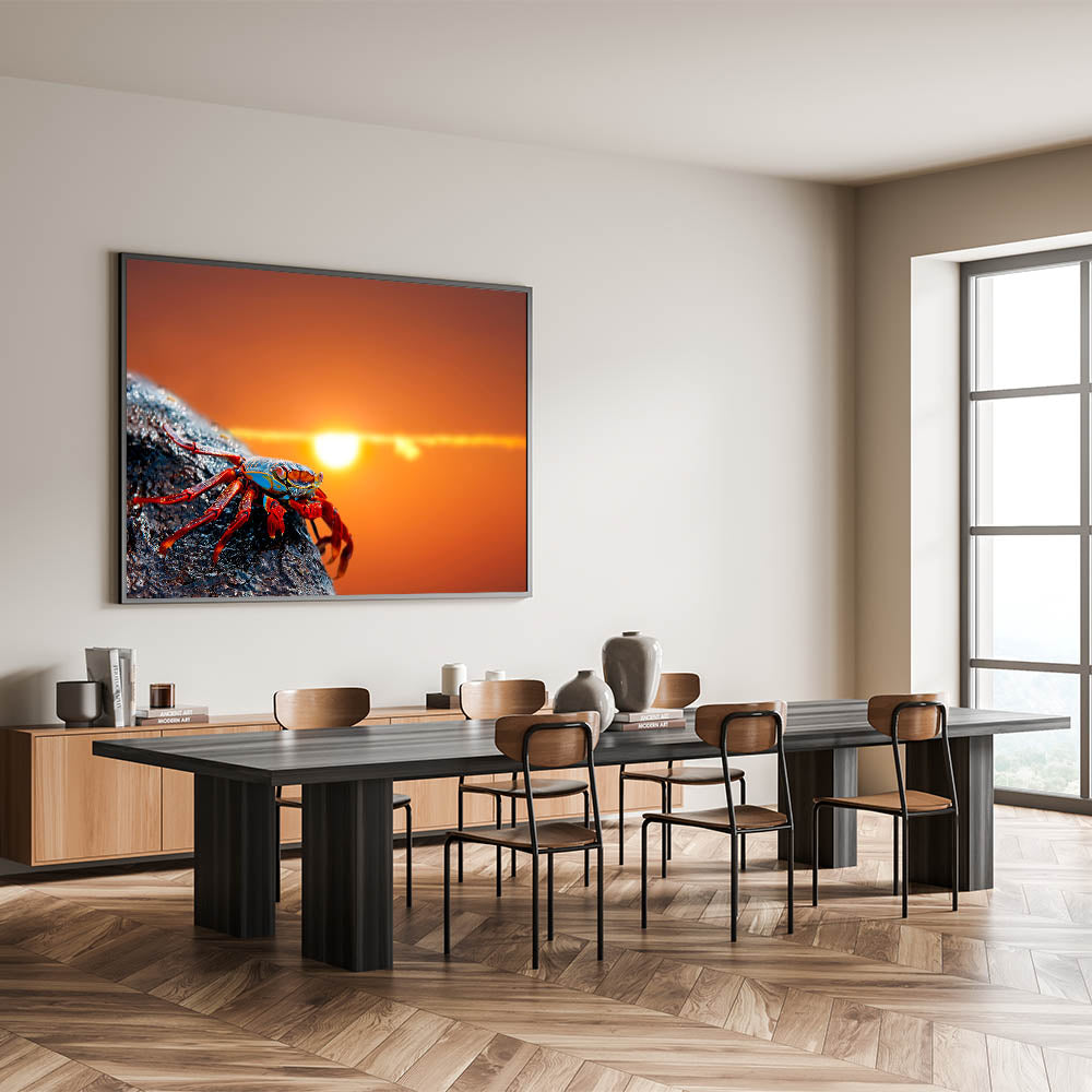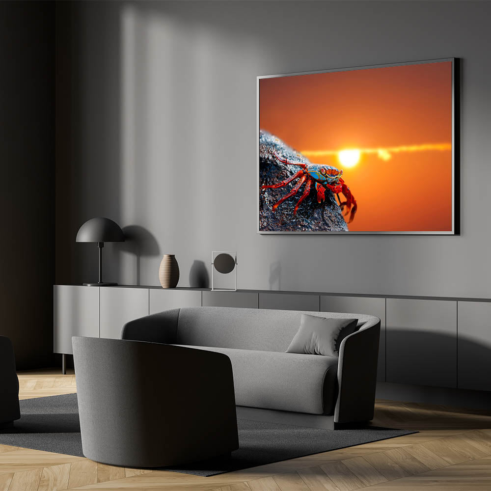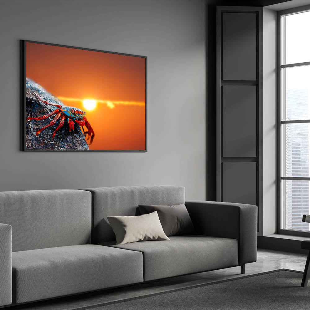- High-Resolution Photography: Captures the fine details of the crab and the stunning sunset, offering an eye-catching display.