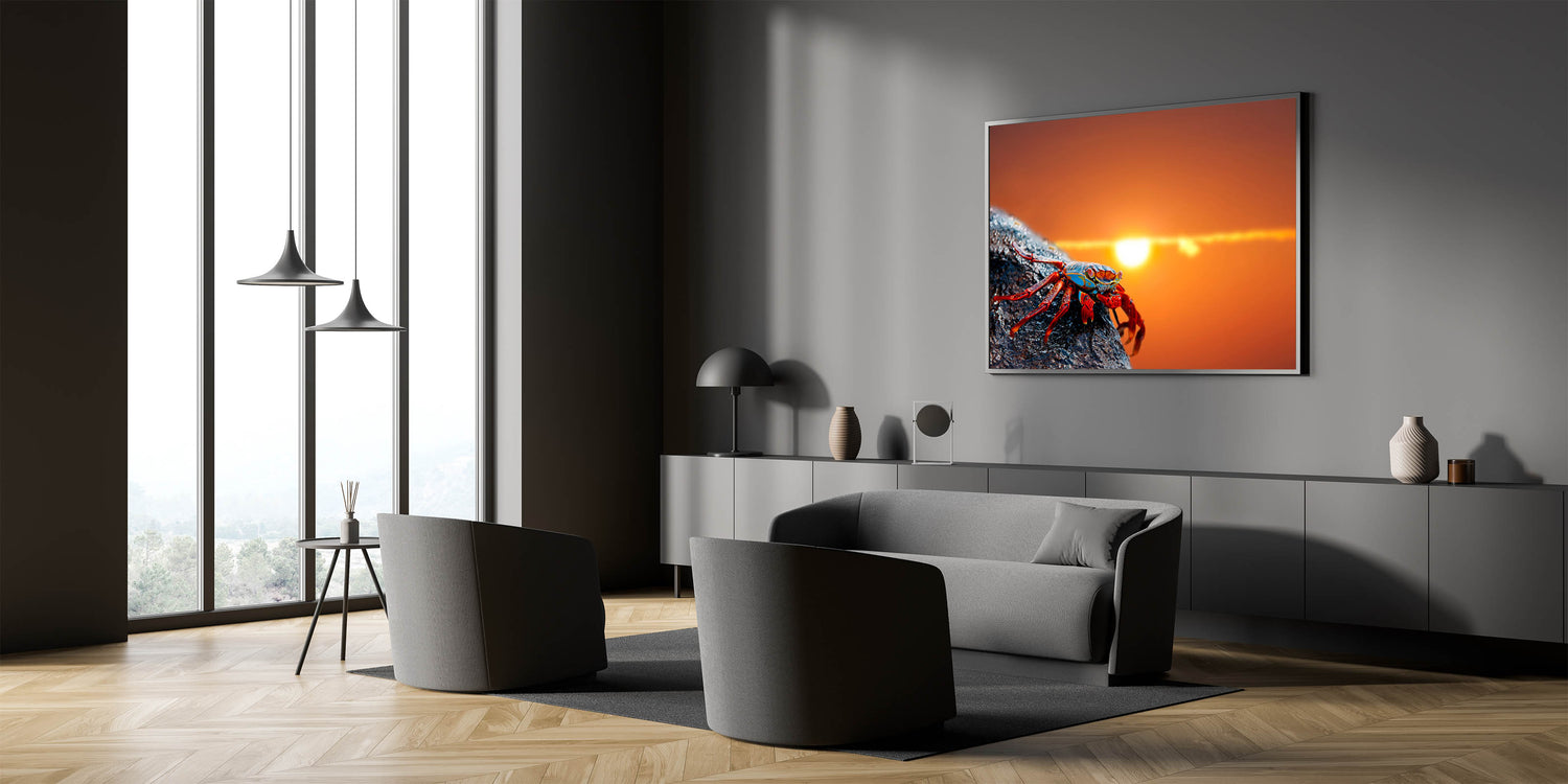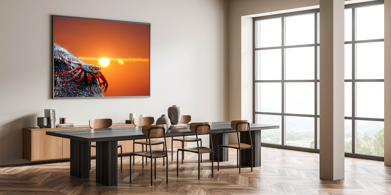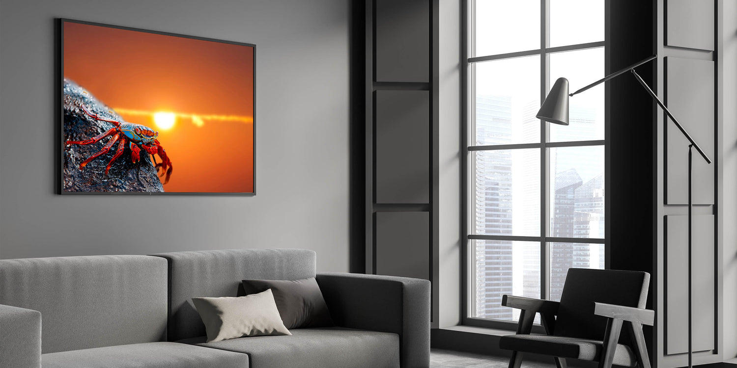- High-Resolution Photography: Captures the fine details of the crab and the stunning sunset, offering an eye-catching display.