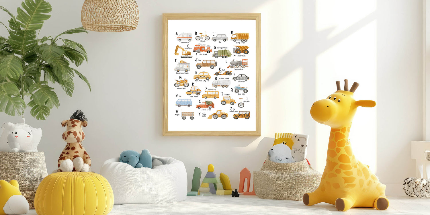 This educational art for kids' rooms makes learning interactive by combining alphabet recognition with vehicle identification. The classroom learning poster is a great addition to preschools, daycares, homeschooling spaces, and playrooms, creating an inspiring learning environment.