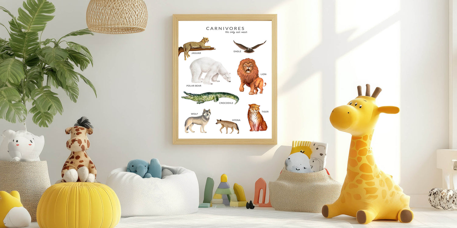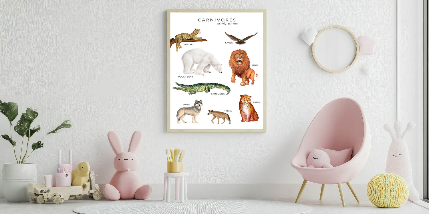 Teach children about meat-eating animals with this Carnivores Kids Educational Wall Art. Featuring beautifully illustrated predators like lions, tigers, wolves, jaguars, crocodiles, and more, this engaging poster helps children identify carnivorous animals and understand their role in nature. Perfect for kids' rooms, nurseries, and classrooms, this artwork makes learning about wildlife fun and interactive.