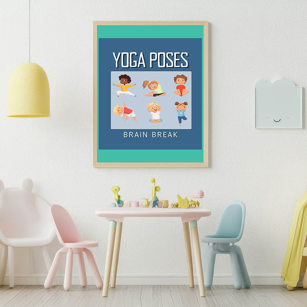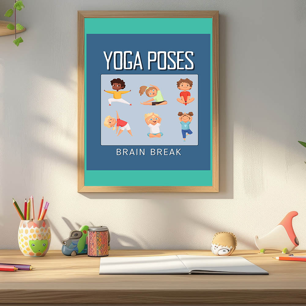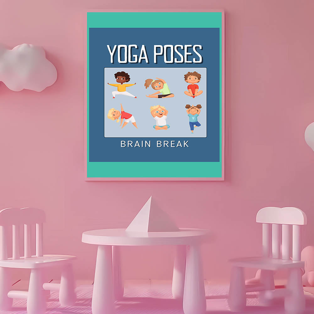 Encourage mindfulness and movement with this Classroom Educational Poster, featuring fun and engaging yoga poses for kids designed for brain breaks. This colorful illustration showcases children performing simple yoga postures, making it a perfect addition to classrooms, kids' playrooms, and homeschool spaces.