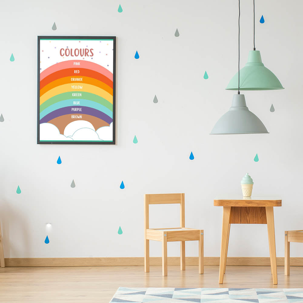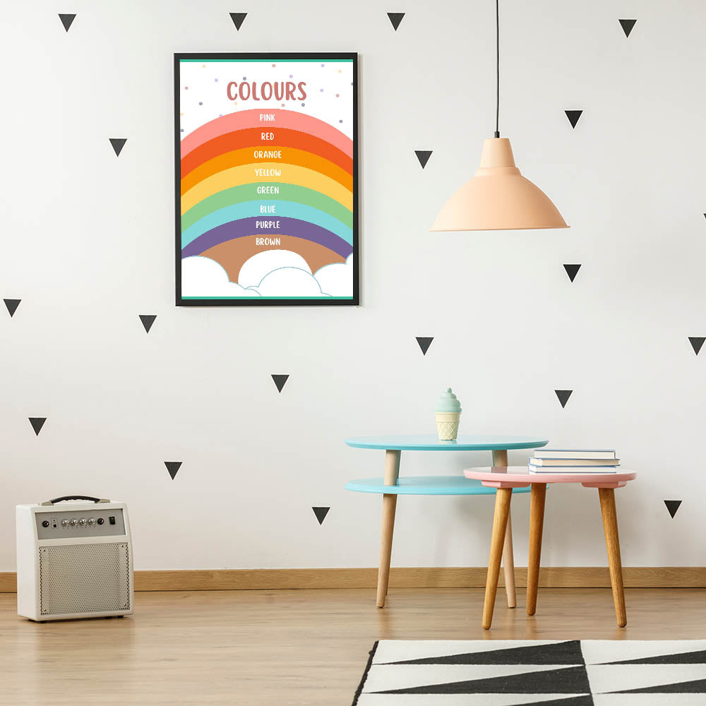 Introduce children to the world of colors with this Kids Educational Wall Art featuring a vibrant rainbow-themed design. This engaging poster showcases pink, red, orange, yellow, green, blue, purple, and brown, helping young learners recognize and memorize different colors in a fun and visually appealing way. Ideal for nurseries, playrooms, and classrooms, this educational nursery wall decor encourages early learning and creativity.